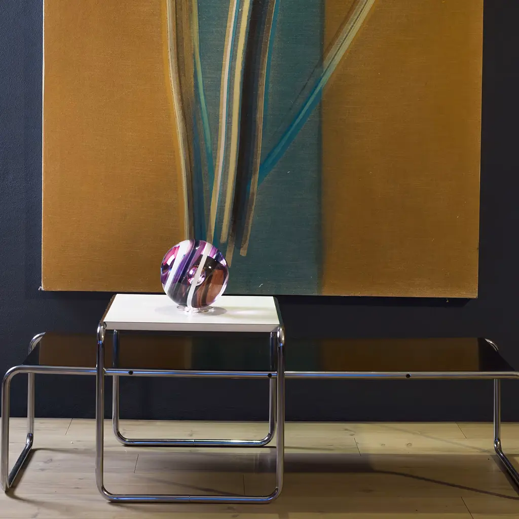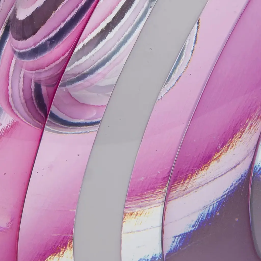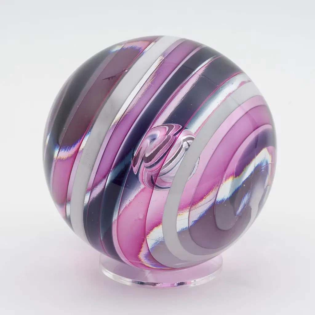 Marked by a mesmerizing pattern intended to serve as a meditative tool, this singular glass sphere combines skilled Murano hand craftsmanship with artist Vittore Frattini's contemporary design. Showcasing delicate pink and violet hues, each unique piece will have a captivating impact in any modern home or office interior.