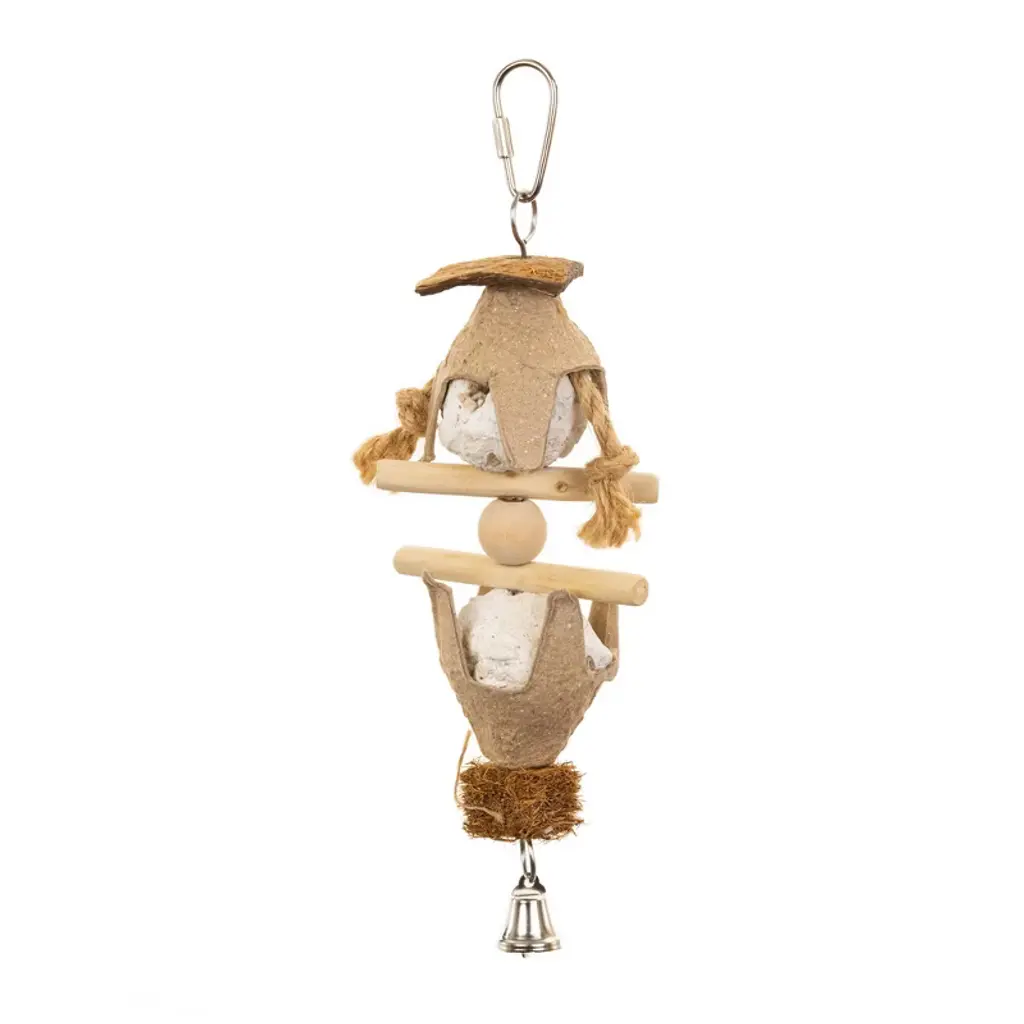 Naturals Lava Cubes & Spheres #60260 Bird Toy from Prevue Pet Products is a versatile and engaging toy designed for small to medium-sized birds, such as parakeet and cockatiel. This toy is meant to provide both physical and mental stimulation to keep your bird entertained and active. It offers various elements such as moving parts, balancing challenges, manipulative components, and materials for chewing. Engaging with these different aspects of the toy can contribute to your bird's overall well-being, both physically and mentally. Lava Cubes & Spheres contains many moving parts held together on a stainless steel wire. Materials include hardwood beads, folded palm leaf flowers, woven rattan balls, hard pumice blocks and sunflower stalk chunks. Measures approximately 3 1/2" long by 3 1/2" wide by 15" high. Since the toys are handmade, there might be slight variations in shape and size. Regularly inspect the toy for any signs of wear or damage, and replace it when it's used or worn out to ensure your bird's safety and continued enjoyment.
