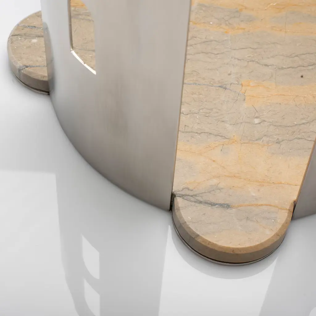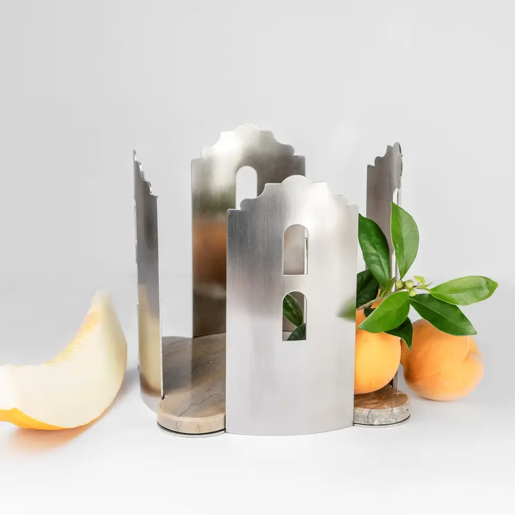 Self-standing facades in brushed stainless steel paying homage to the glorious Baroque architecture of Palermo, Sicily is the distinguishing element of this centerpiece. Exceptionally evocative, the base in Grigio Ducale marble reveals superb traceries that make the one-of-a-kind. Multiple options featuring different marble types are available, please contact the Concierge.