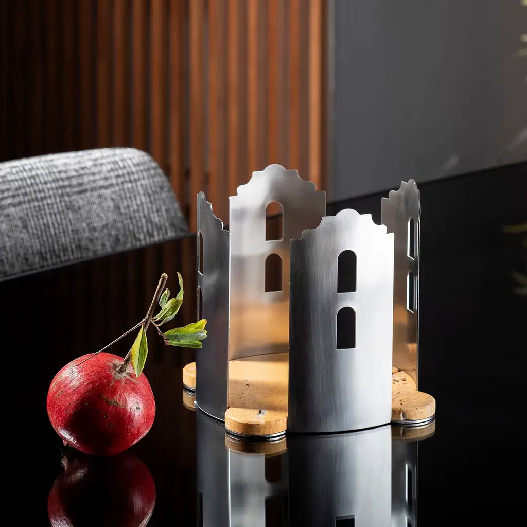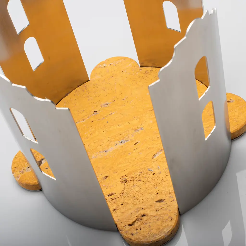 This original design homaging Palermitan architecture will elegantly host floral compositions or fruit on contemporary tables. The vibrant base in yellow travertine is shaped like a floor plan, surrounded by four self-standing facades simultaneously playing functional and outstanding decorative roles. Please contact the Concierge to check other available marble variants.