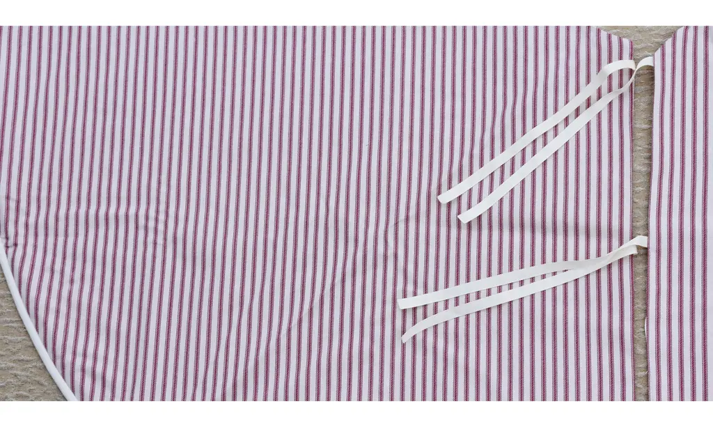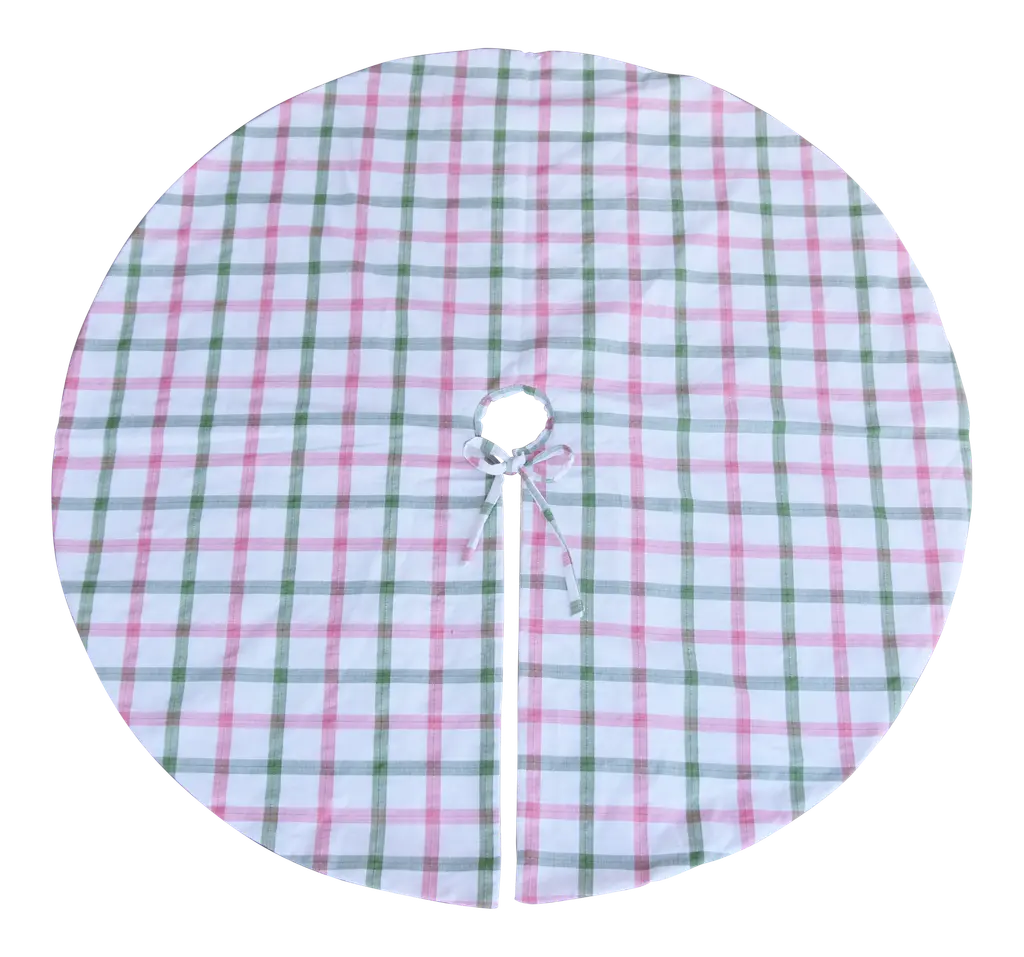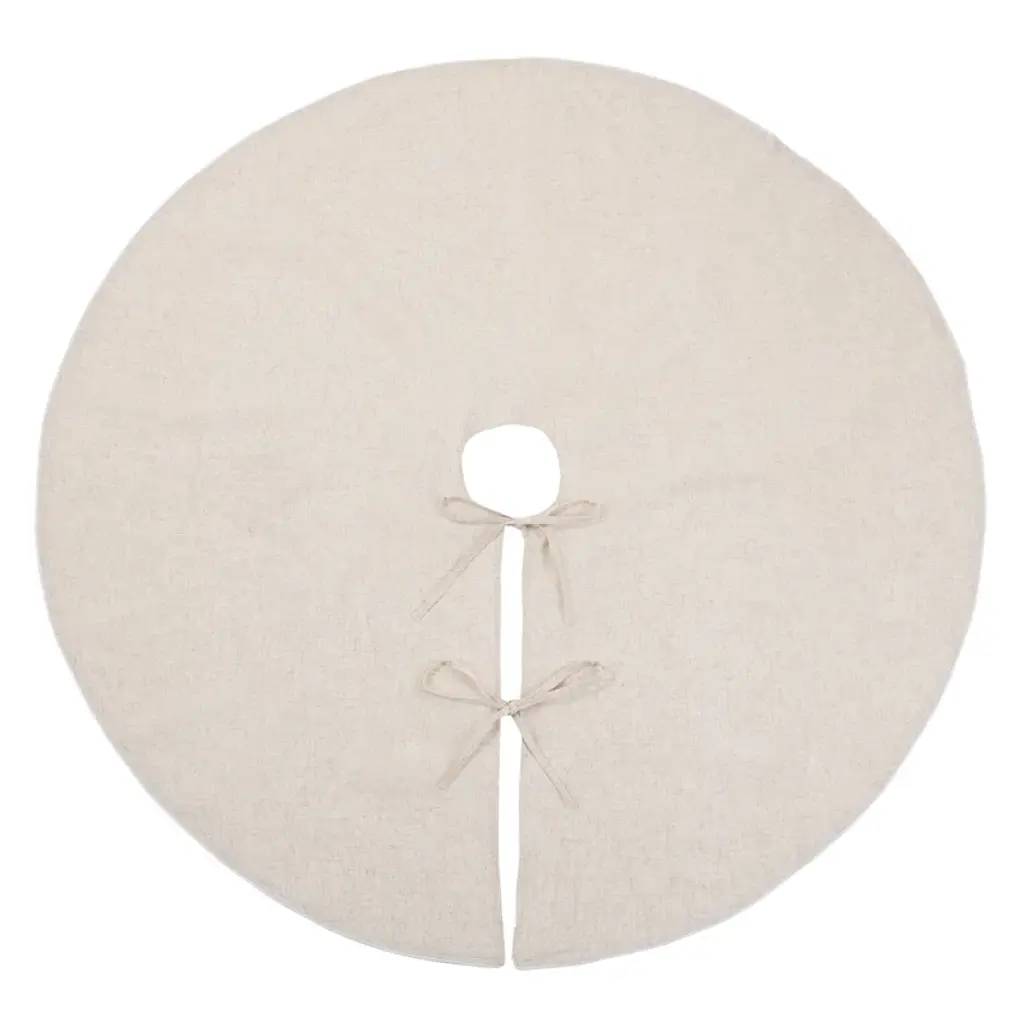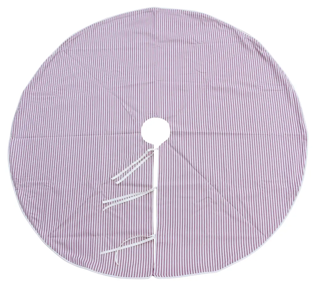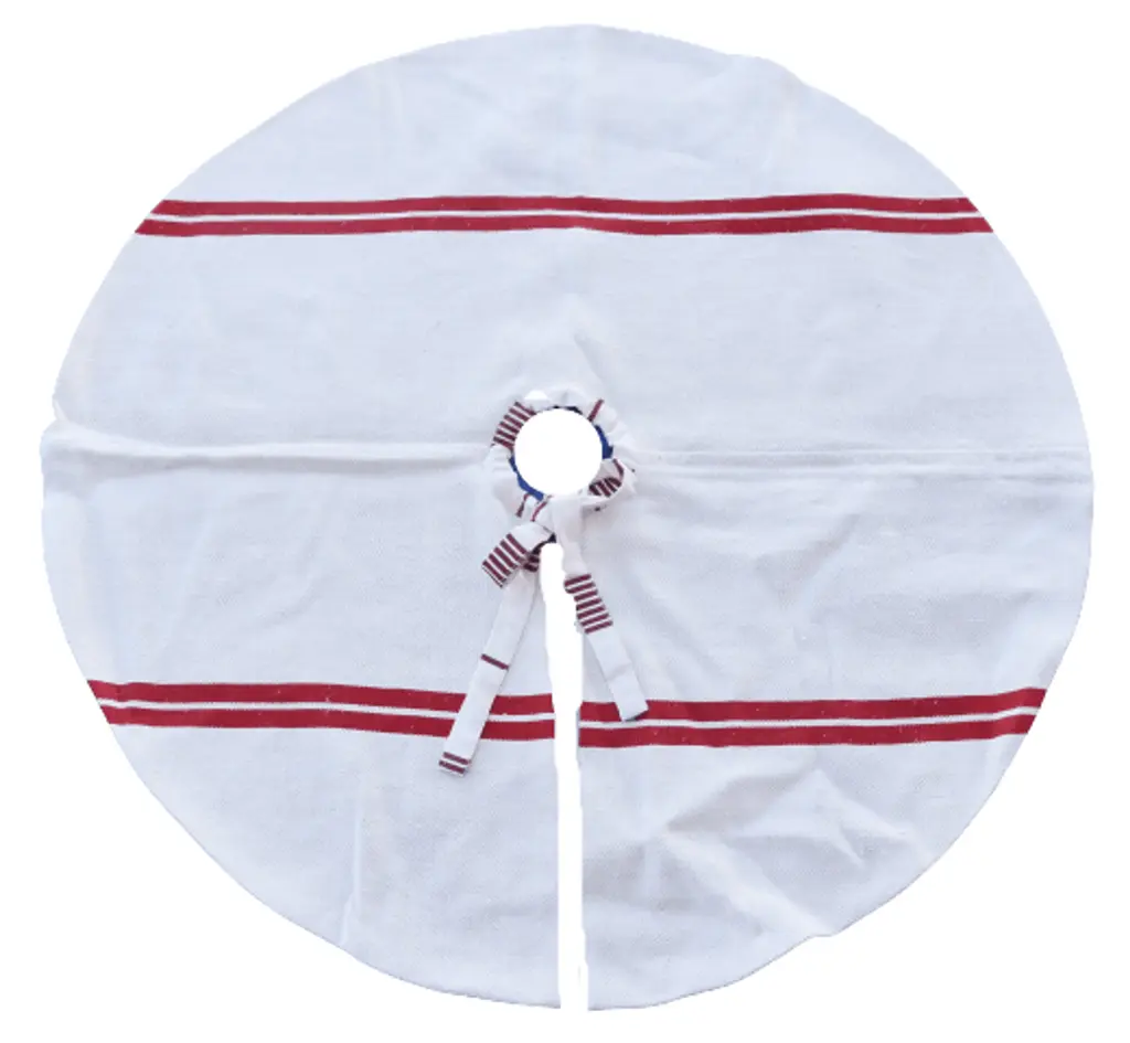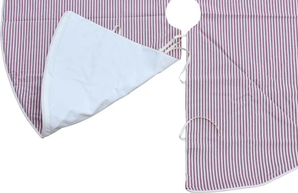 Large 54" custom-tailored Christmas tree skirt made from vintage red-and-cream French farmhouse-style cotton ticking fabric. Accented with three ribbon ties and custom cord trim. Reverse is lined with a vintage solid cotton fabric. No maker's mark. Excellent new unused condition.