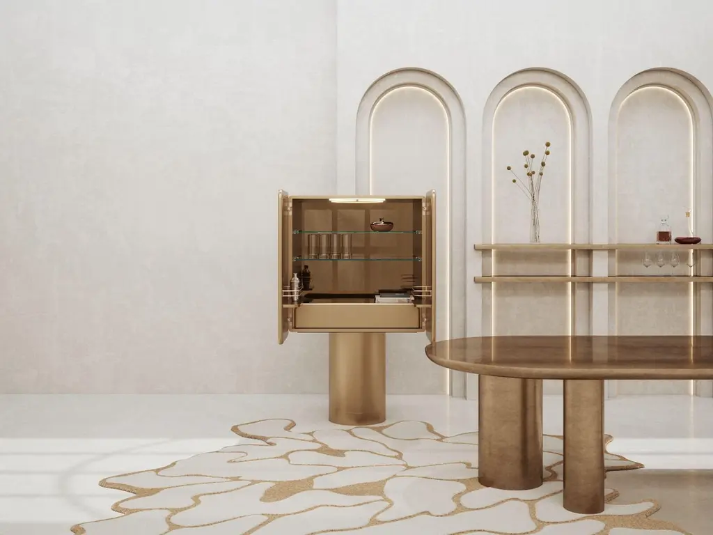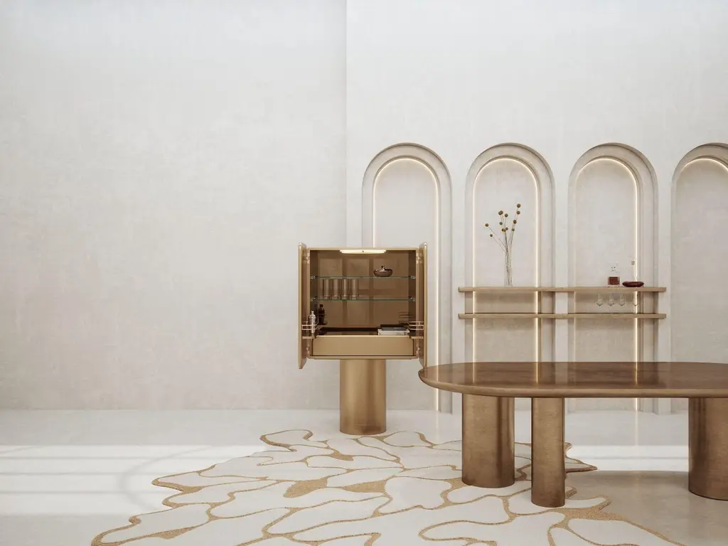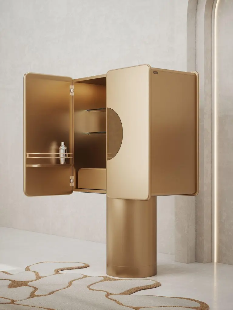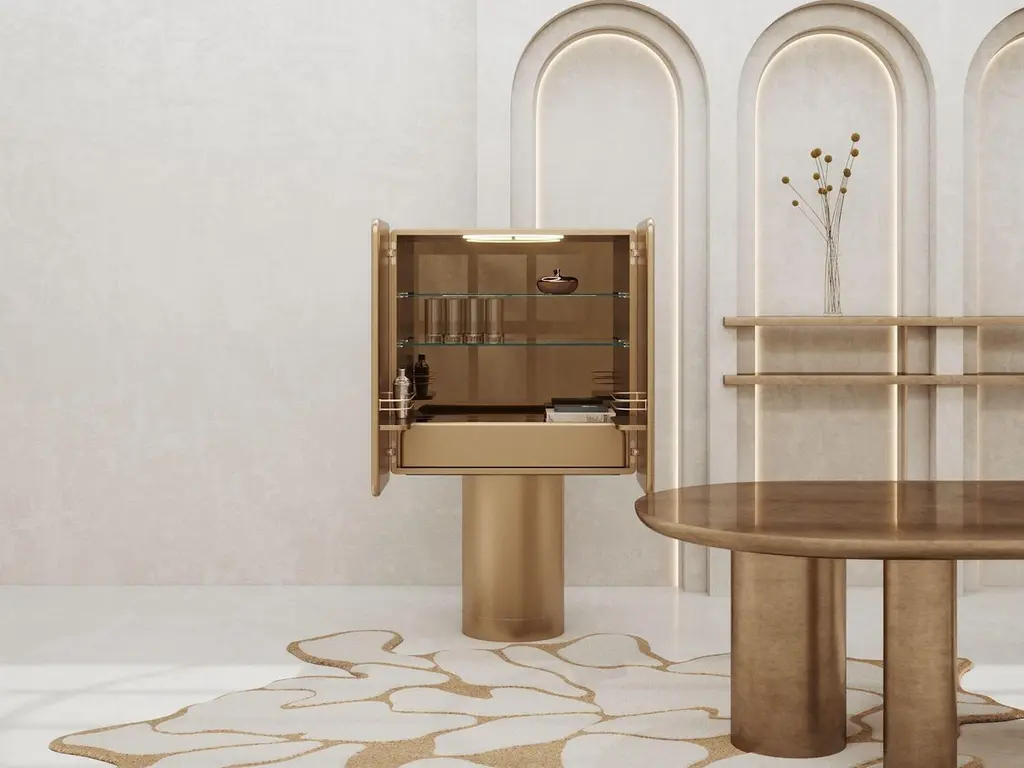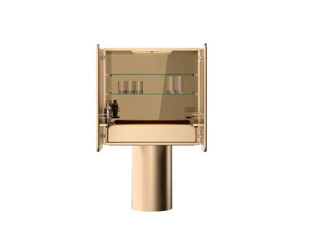 Shiny gold lacquered finish for Regis Bar Cabinet creates a stunning effect of radiance. Bar Cabinet with two rounded doors on cylinder base. Gold mirror inserts on the doors and interior back and top. Internal drawer, glass shelves, side pockets and LED lighting with sensor for automatically switch on.Handmade in ITALY