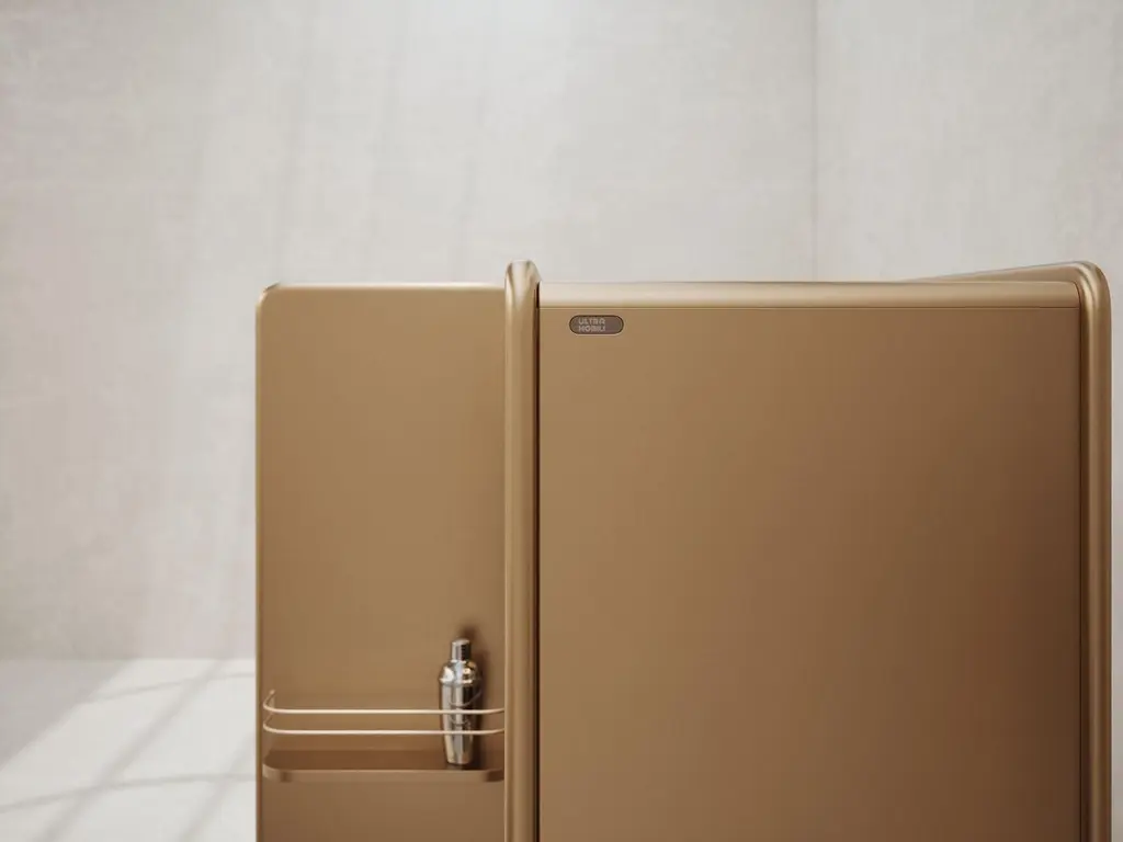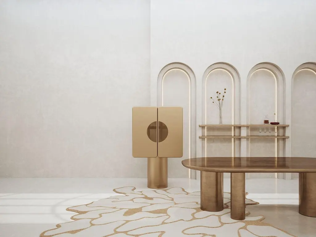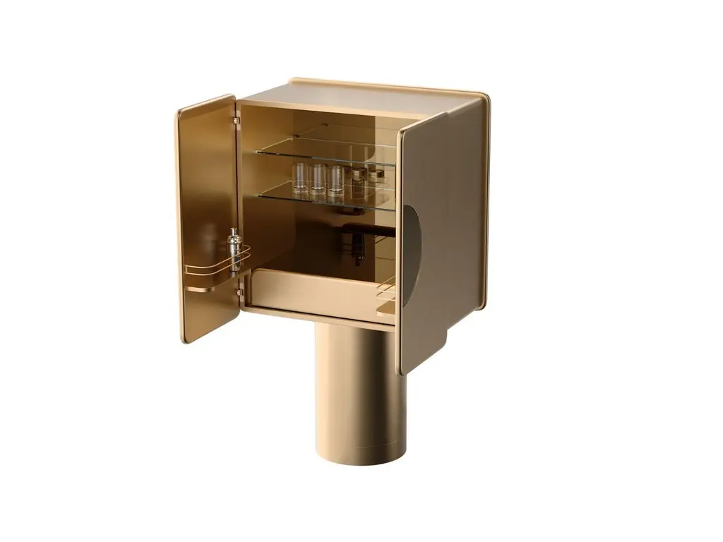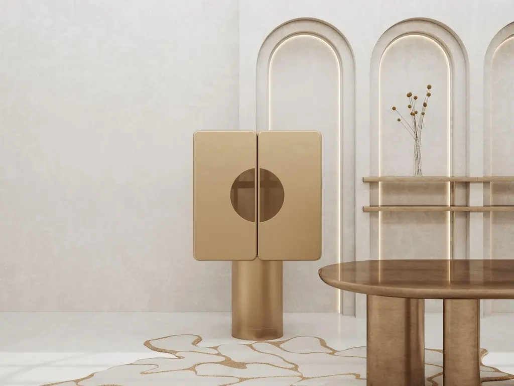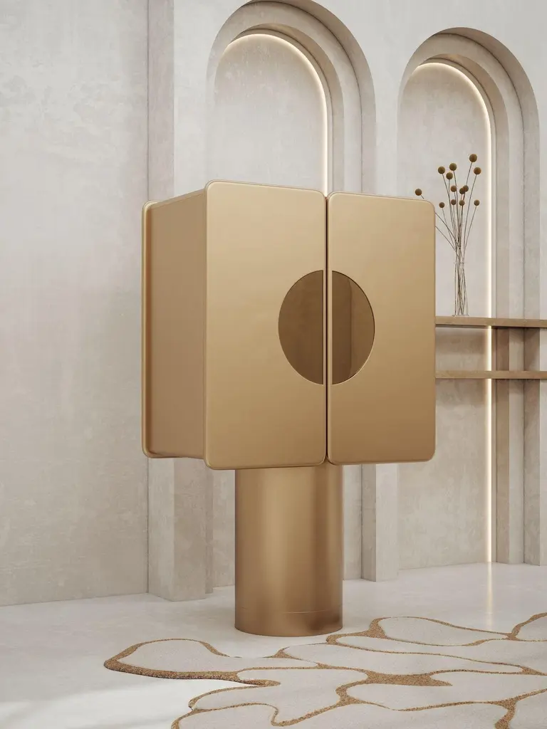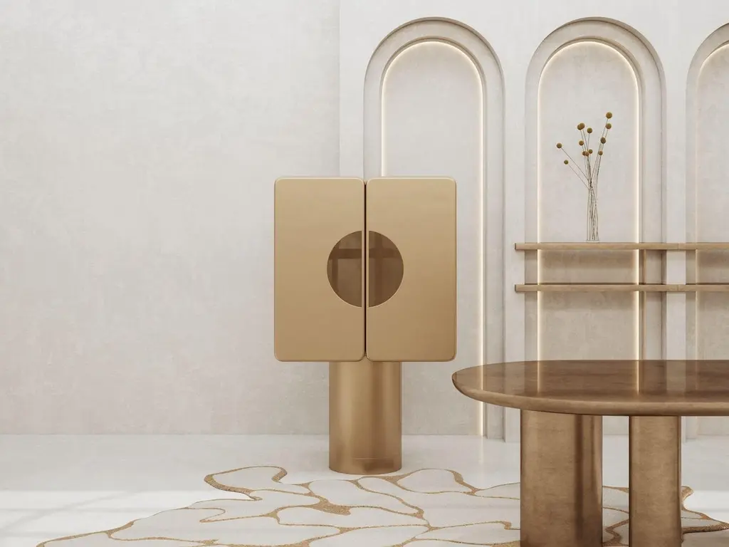 Shiny gold lacquered finish for Regis Bar Cabinet creates a stunning effect of radiance. Bar Cabinet with two rounded doors on cylinder base. Gold mirror inserts on the doors and interior back and top. Internal drawer, glass shelves, side pockets and LED lighting with sensor for automatically switch on.Handmade in ITALY