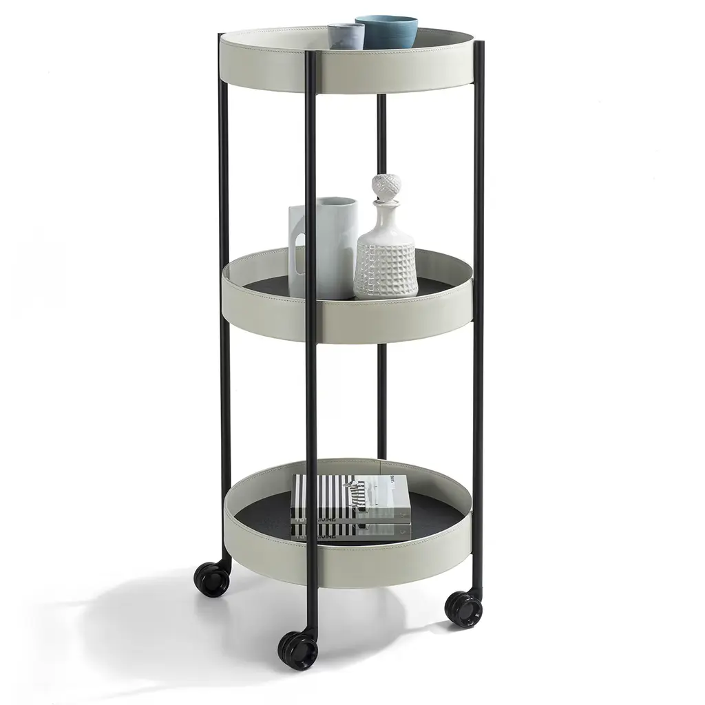 The Route Totem Cart features a sleek tubular metal structure with a refined painted finish, combining durability with contemporary elegance. Its wooden trays add warmth and sophistication, while the leather-covered edges provide a luxurious touch. A perfect fusion of functionality and high-end craftsmanship, this cart is designed to enhance any refined living space with its stylish and versatile presence.