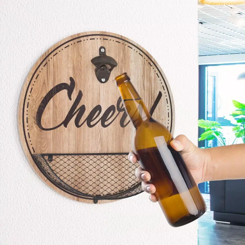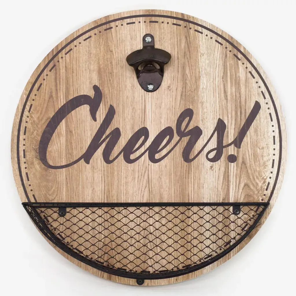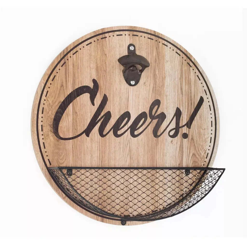 Rustic Wood Textured 'cheers' Bottle Opener/cap Catcher Wall Sign Panel - American Art Decor: Mesh Wire, Mdf