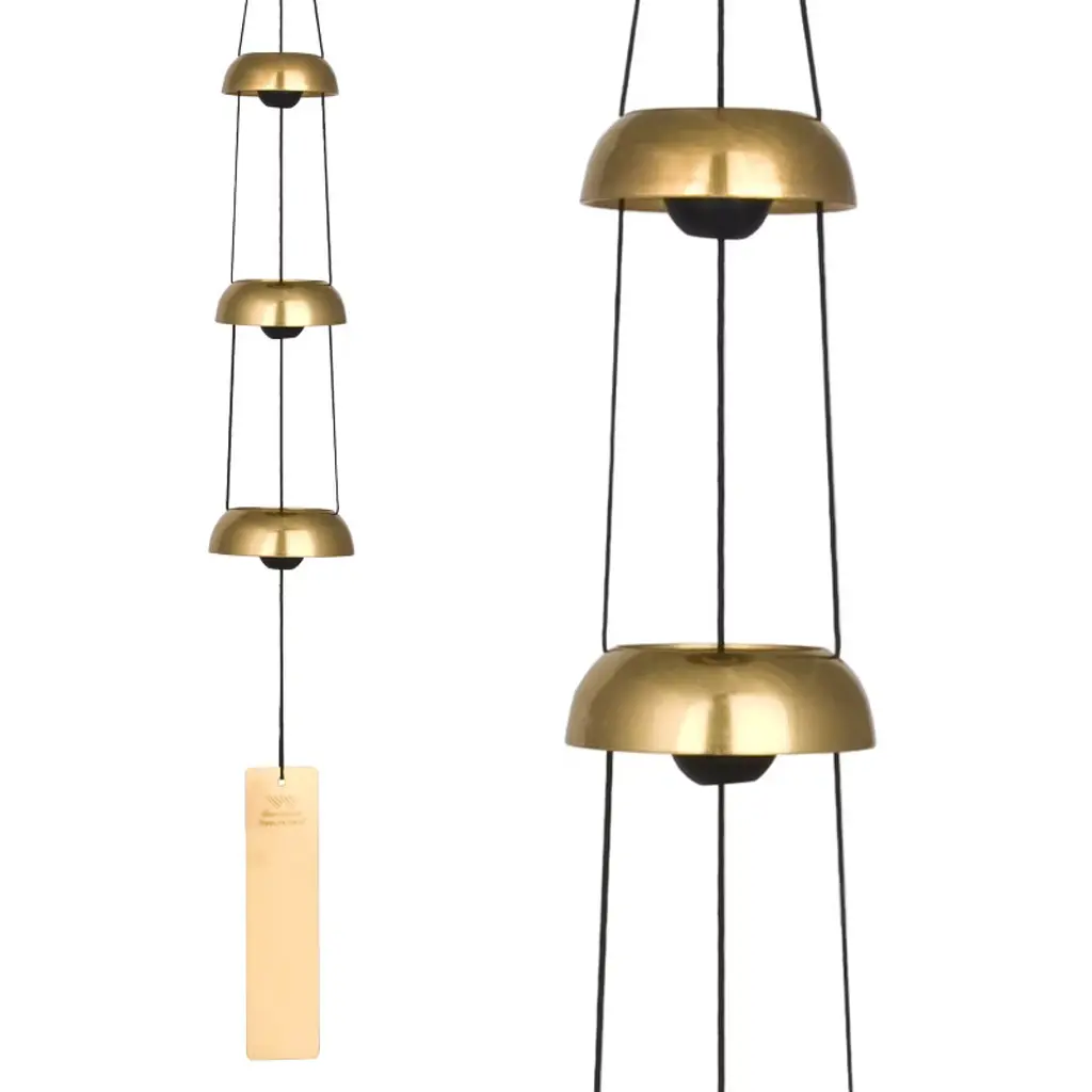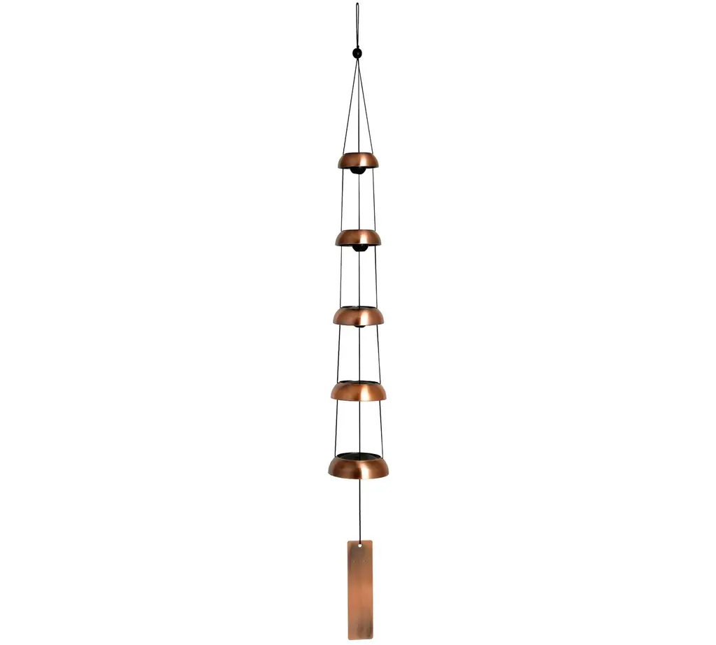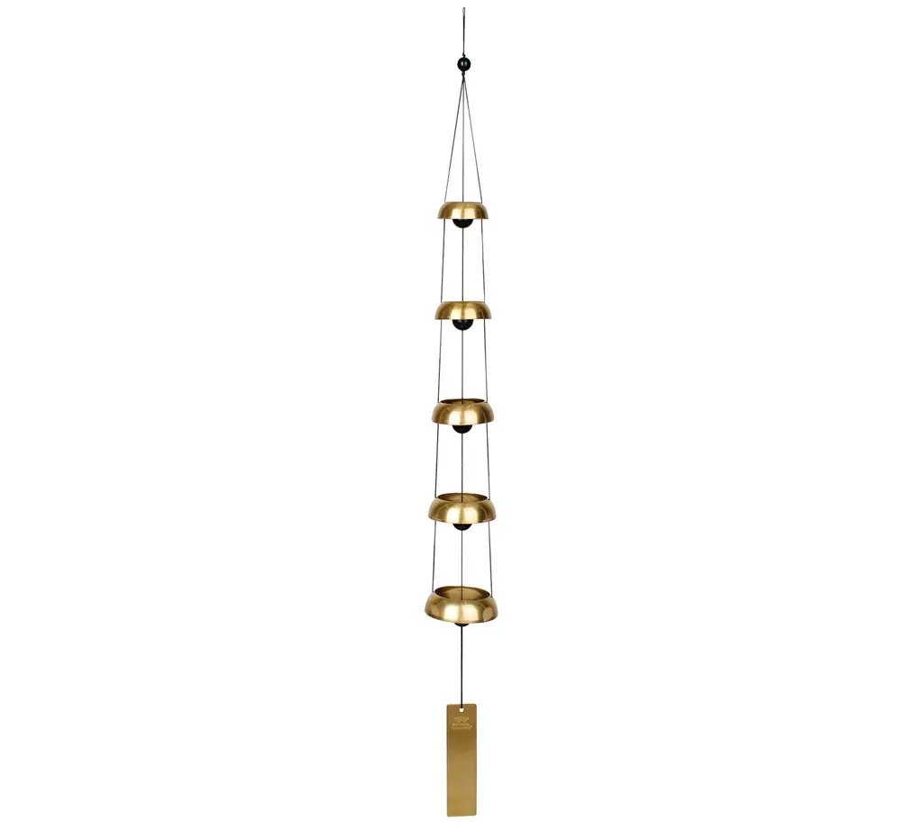 Sound therapy for outdoor spaces. Turn a patio or garden nook into a peaceful sanctuary with this handcrafted wind chime, featuring five brass rings that resonate with the soulful hum of Tibetan singing bowls.