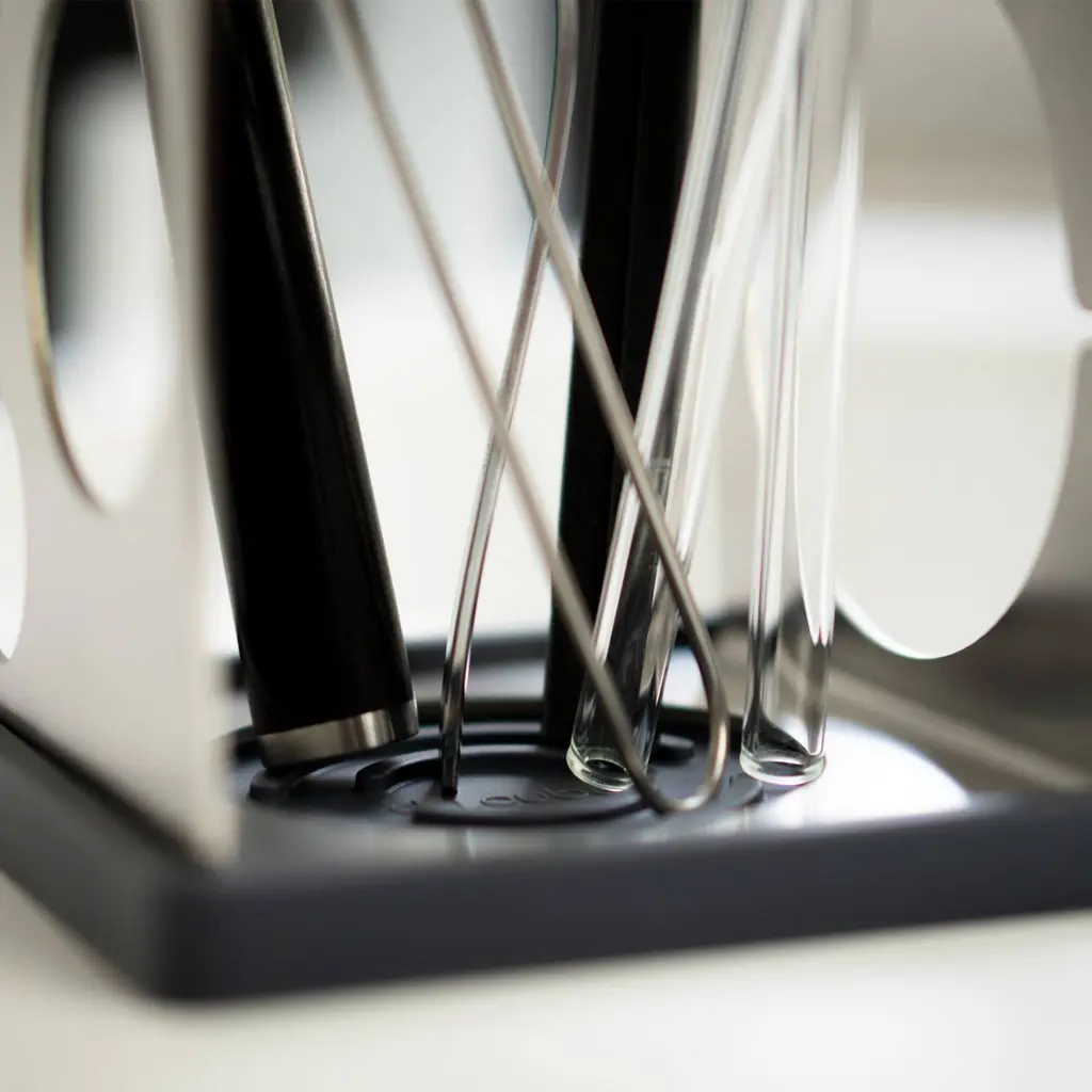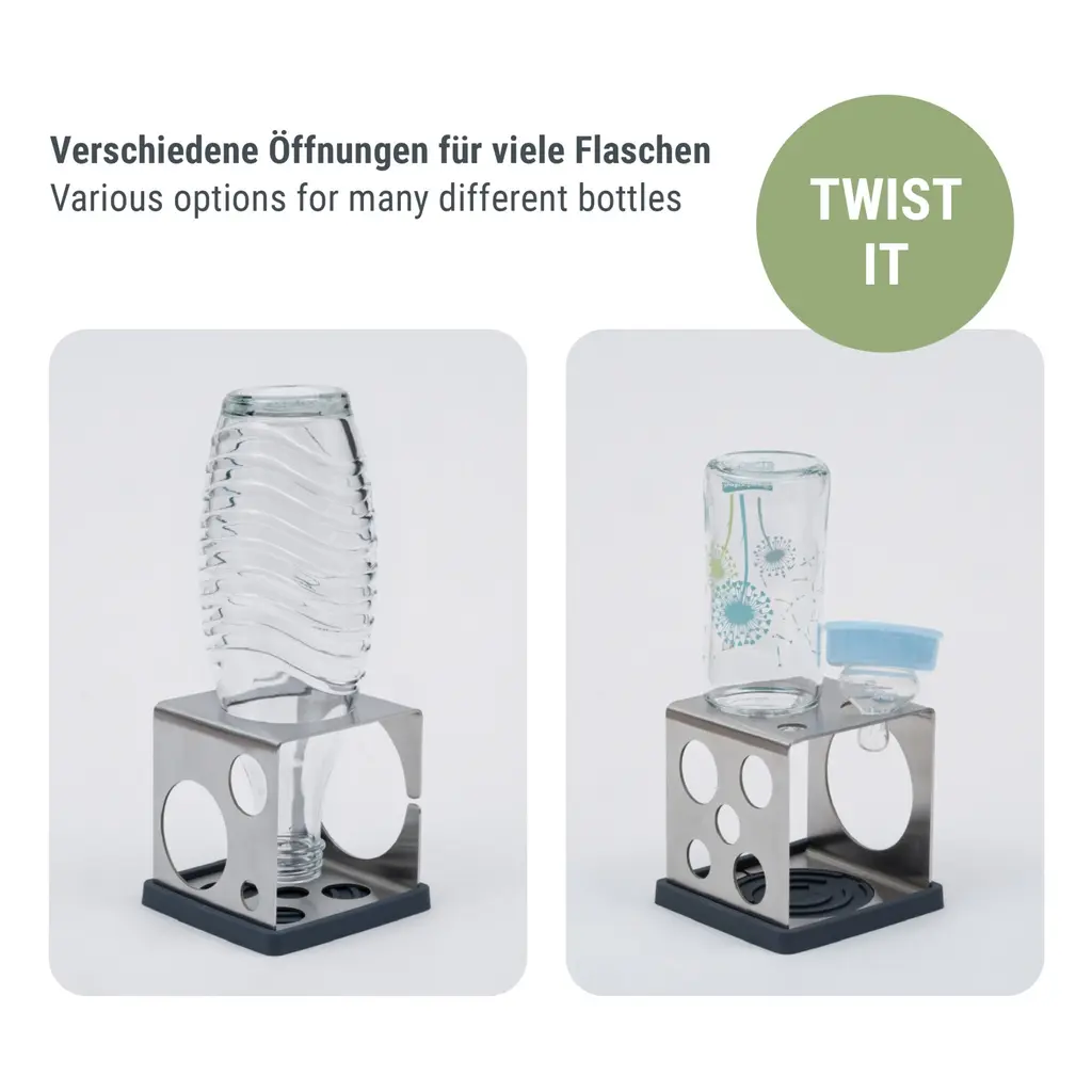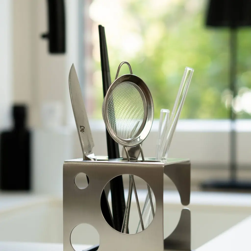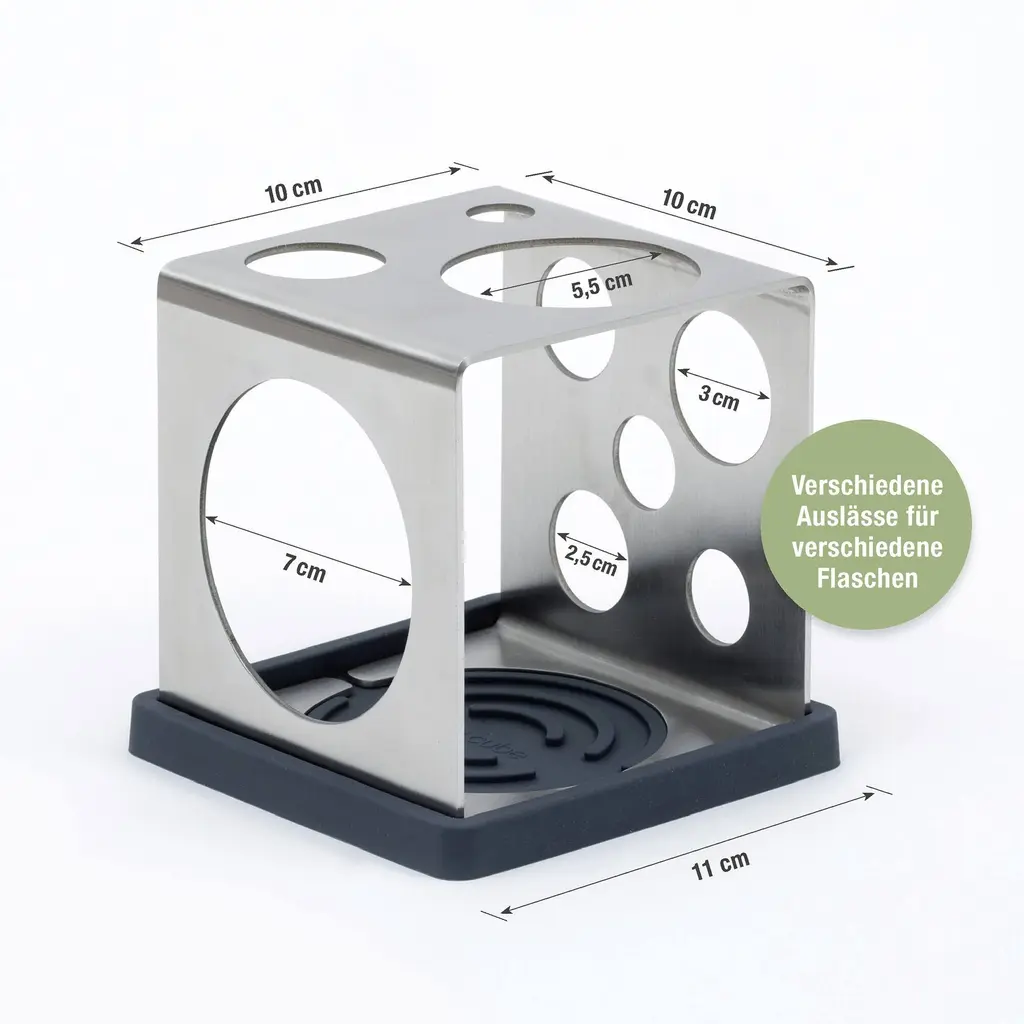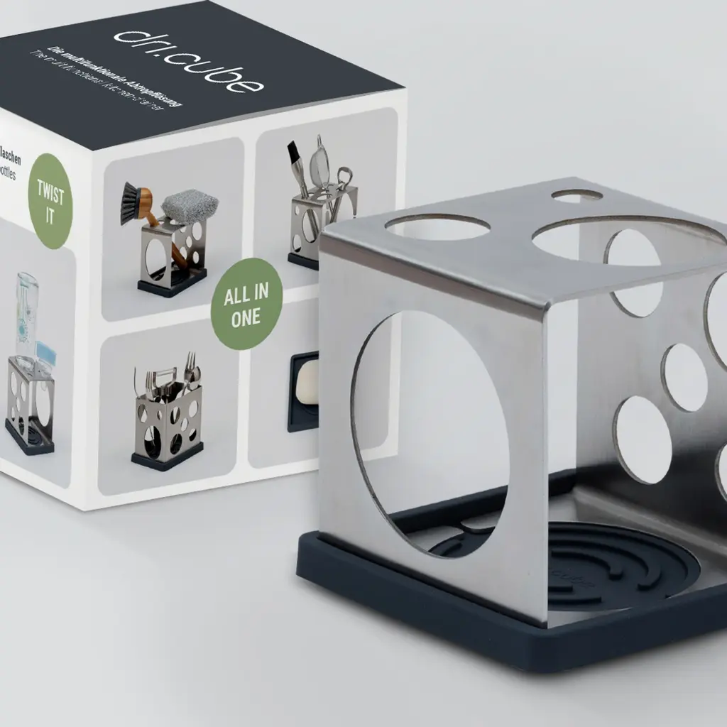 Sanni Shoo dri.cube - NewIntroducing the dri.cube Kitchen Sink Caddy & Drainer, a multi-purpose solution for all your kitchen needs. Designed to efficiently drain bottles, cups, straws, cutlery, knives, and spoons, this innovative caddy is perfect for organizing your kitchen while saving space. The cube design (3.94 x 3.94 inches) utilizes all six sides for maximum draining capacity, ensuring your kitchen remains tidy and clutter-free. Crafted from high-quality stainless steel (18/8) and platinum silicone, the dri.cube adds a touch of sophistication to any kitchen decor. Available in both black powder-coated and brushed stainless steel finishes, it combines style with functionality. Its versatile compatibility makes it suitable for almost all bottle sizes, including Aqua Fizz, and adaptable for various kitchen utensils. With its dishwasher-safe and heat-resistant (up to 428°F) properties, the dri.cube ensures effortless cleaning and durability, providing convenience and peace of mind for busy households. Enhance your kitchen organization with the dri.cube Kitchen Sink Caddy & Drainer and experience the perfect blend of style, efficiency, and functionality.FEATURES:MATERIAL:WHAT'S IN THE BOX:PACKAGING: Retail Packaging