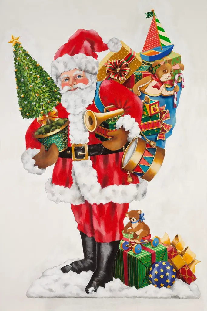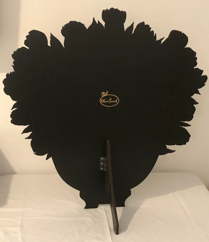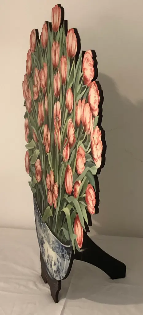 DESCRIPTION Screen printed and varnished onto flat wood board, produced from an original Katharine Barnwell oil painting. Stand is hinged so that piece can be stored flat. Example of stand can be seen in images. Made in USA DIMENSIONS 42”H x 23.5"W x 6.5”D (with stand)