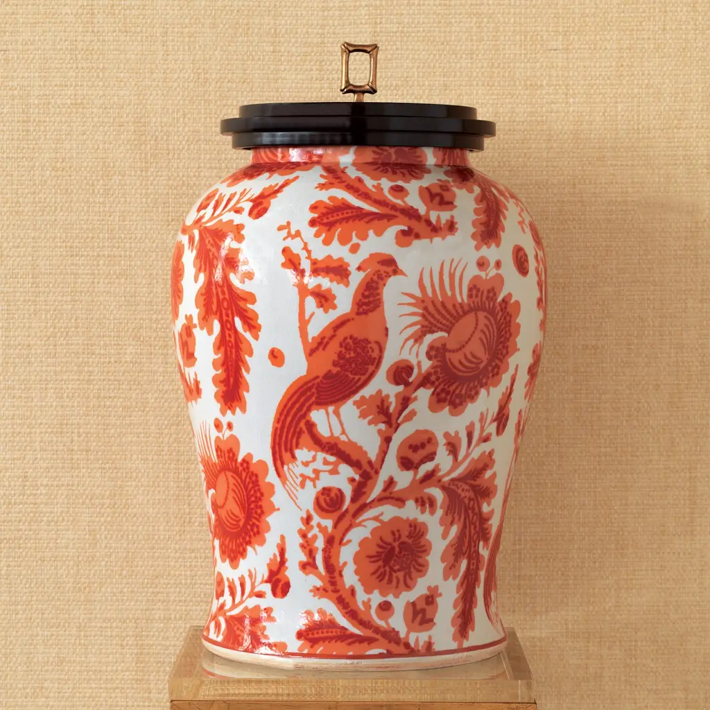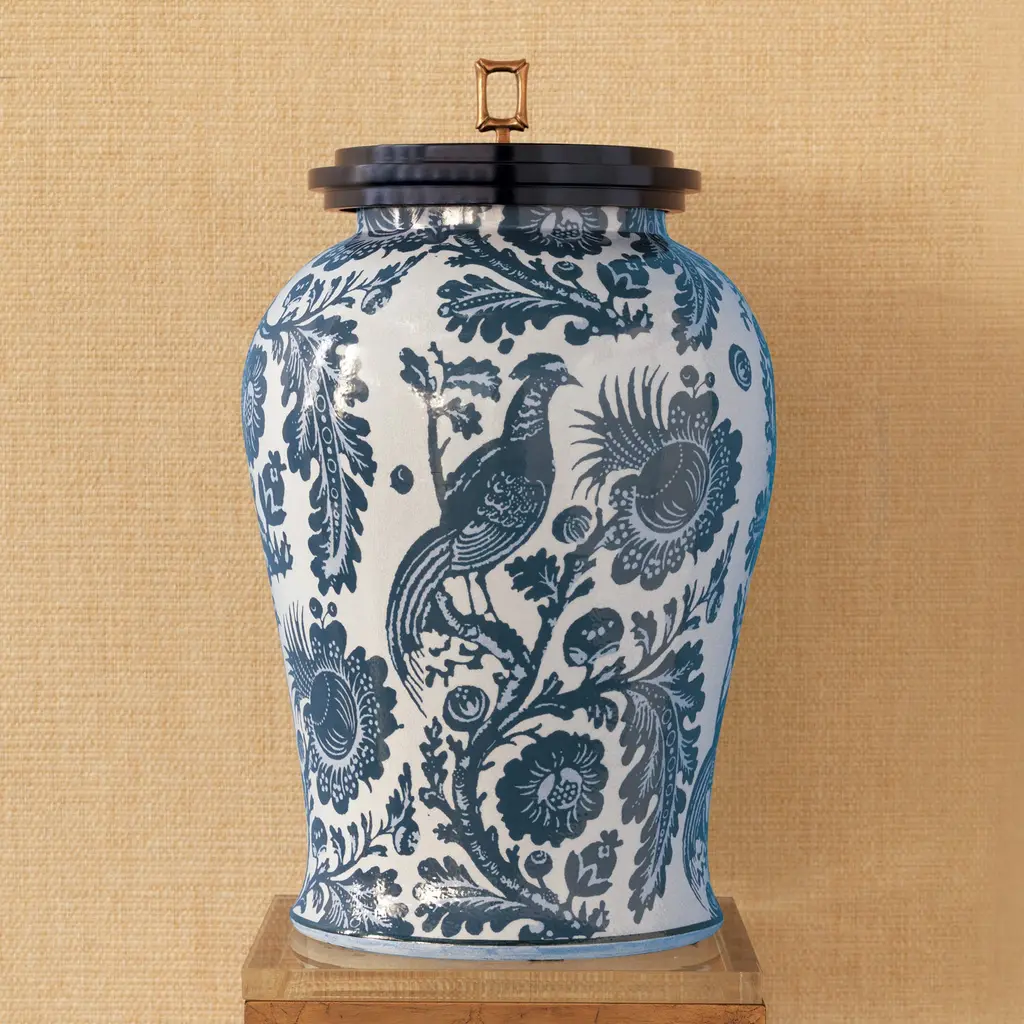 Grand and classic, the Arcadia jar by Scalamandre Maison for PORT 68 is inspired by Scalamandre's archival 'resist' fabric. Accented with a black wood lid and solid brass square bamboo finial. Available in coral or indigo blue Materials: porcelain, wood, brass Size: 21"H x 13"D Free shipping in the U.S.