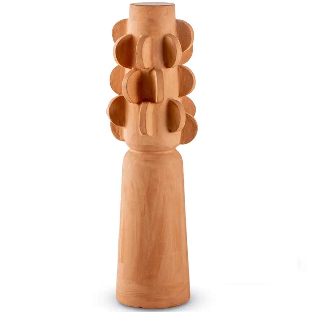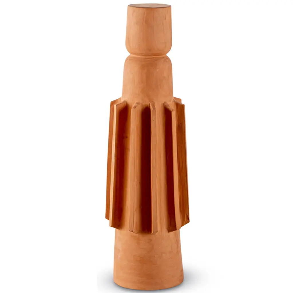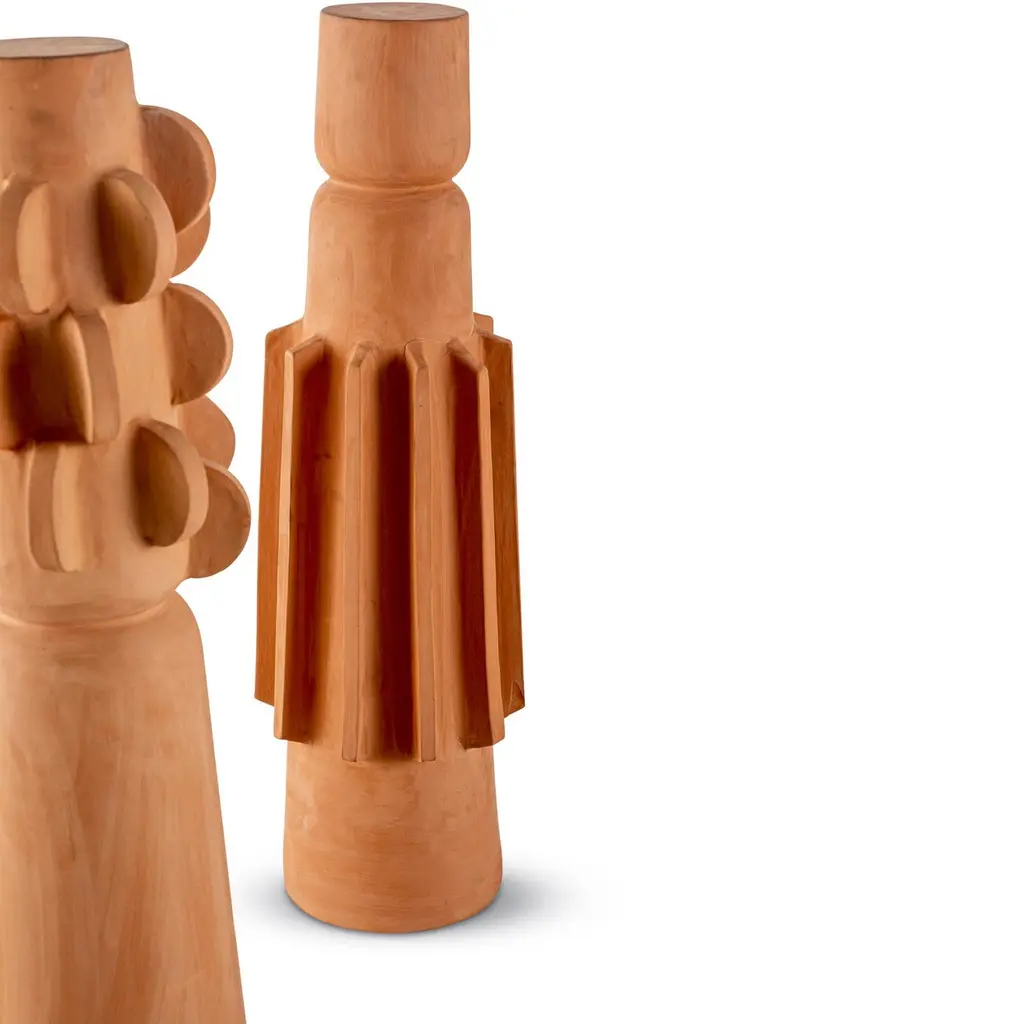 This modern sculptural Brutalist decorative totem set by Egg Designs merges sculptural form with primitive inspiration. Handcrafted in unglazed terracotta, the design draws on tribal motifs, showcasing bold geometric reliefs and intricate surface detailing. Its unglazed finish highlights the natural warmth of terracotta, celebrating the raw, earthy quality of this ancient material while offering a modern, architectural interpretation.This set is versatile enough for both table and floor placement, acting as a focal point in minimalist, modern organic, or art-driven interiors. Whether displayed alone as a statement or arranged with additional totems, it creates dynamic visual interest and texture within a space.Each totem is handmade to order by Egg Designs, ensuring unique character and quality. Standard lead time: 8–10 weeks. Condition: new.