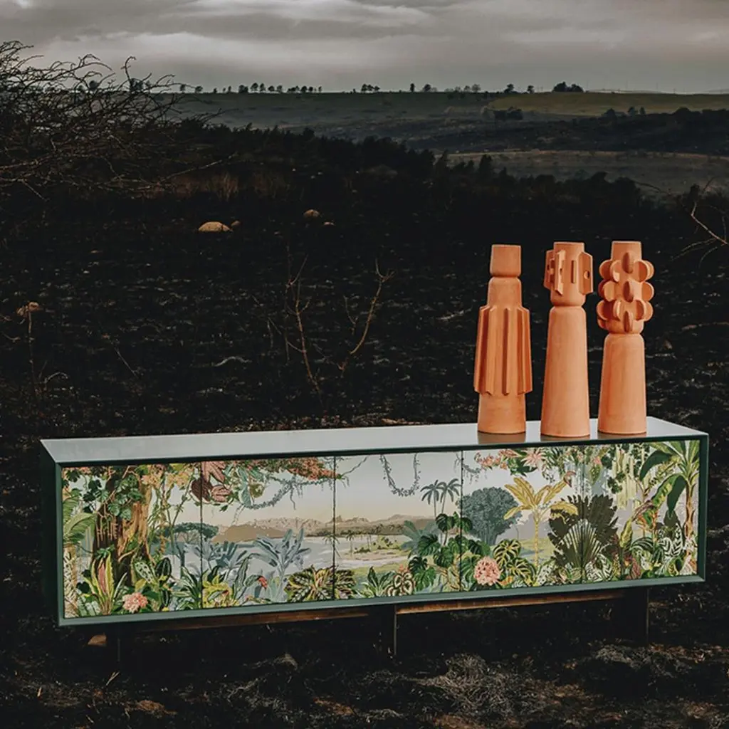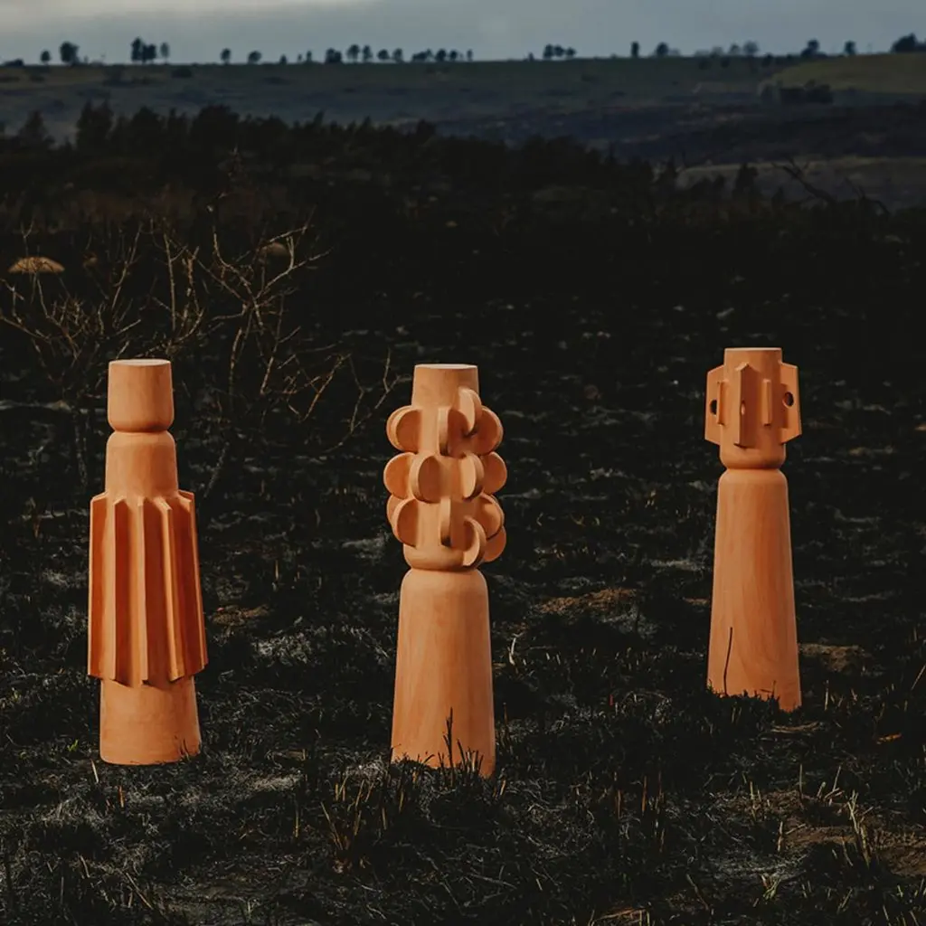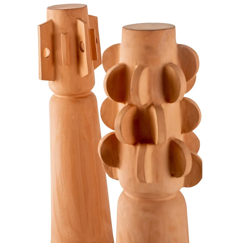 This modern sculptural Brutalist decorative totem set by Egg Designs merges sculptural form with primitive inspiration. Handcrafted in unglazed terracotta, the design draws on tribal motifs, showcasing bold geometric reliefs and intricate surface detailing. Its unglazed finish highlights the natural warmth of terracotta, celebrating the raw, earthy quality of this ancient material while offering a modern, architectural interpretation.This set is versatile enough for both table and floor placement, acting as a focal point in minimalist, modern organic, or art-driven interiors. Whether displayed alone as a statement or arranged with additional totems, it creates dynamic visual interest and texture within a space.Each totem is handmade to order by Egg Designs, ensuring unique character and quality. Standard lead time: 8–10 weeks. Condition: new.
