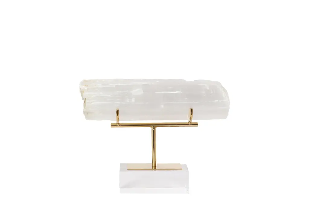 This piece is a tasteful addition with its clear base and simple brass stand. It beautifully showcases a large Selenite Crystal, known for its calm, peaceful properties. This is a natural crystal that will flake, please handle carefully. Variations in color, shape, and size are inherent, expect distinctions that make each piece truly one of a kind. Dimensions: 13" W | 9" H
