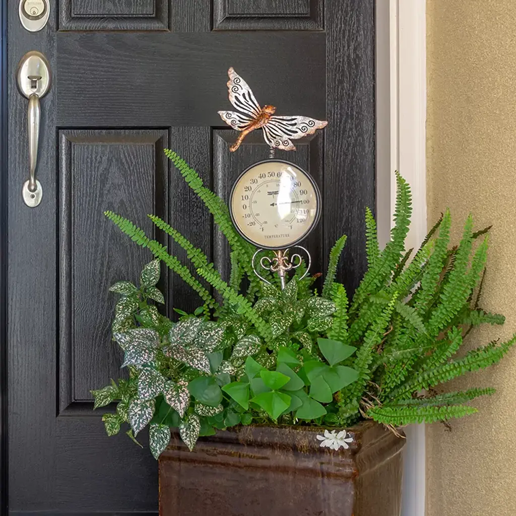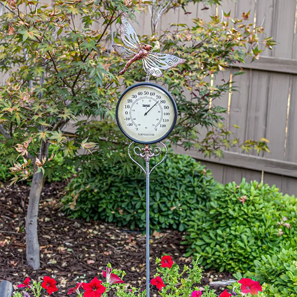 Use this all-weather, dragonfly thermometer in your garden, planter or hang it up to check the temperature all year round. The large thermometer face provides temps in both Fahrenheit and Celsius. The adjustable height allows you to place it in compact areas as well as large spaces. Product Features: Dragonfly iron garden stake thermometer Reads temperatures from -20 degrees to 120 degrees Fahrenheit or -35 to 44 degrees Celsius Can be hung by tab on back or placed in the ground Adjustable height; for compact areas simply leave out the middle pole Hang just the character piece using hang tab on back Easy assembly is required Recommended for outdoor use Dimensions: Fully assembled: 41.75"H x 12.5"W x 2"D Compact Height: 28.25"H x 12.5"W x 2"D Thermometer face: 6.25" in diameter Material(s): iron/plastic