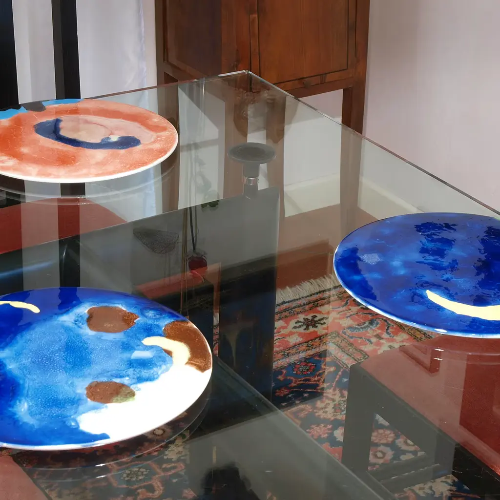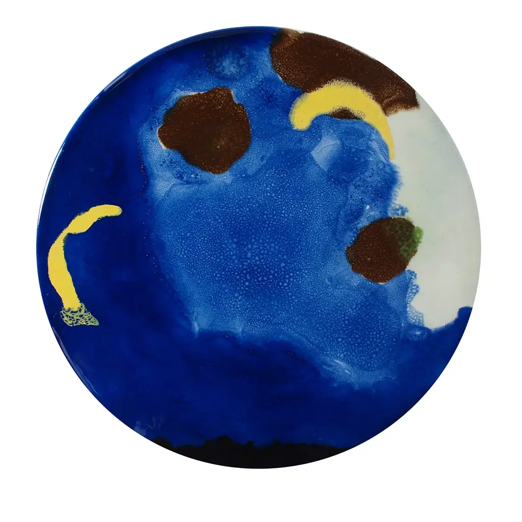 Imbued with artistic allure, this round charger plate handcrafted from the finest Faenza majolica belongs to the "Ceramica in Tavola" Collection. The vibrant color palette depicts a futuristic urban landscape against the backdrop of a sky in flames about to engulf the remaining bits of clear blue sky. A purely decorative objet d'art, this one-off design can be paired with others from the same series for a cohesive, thoughtful look.