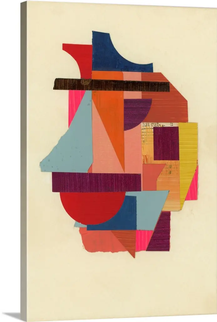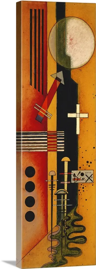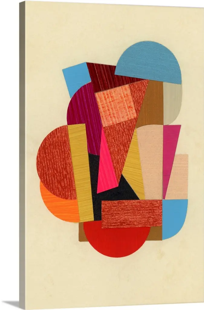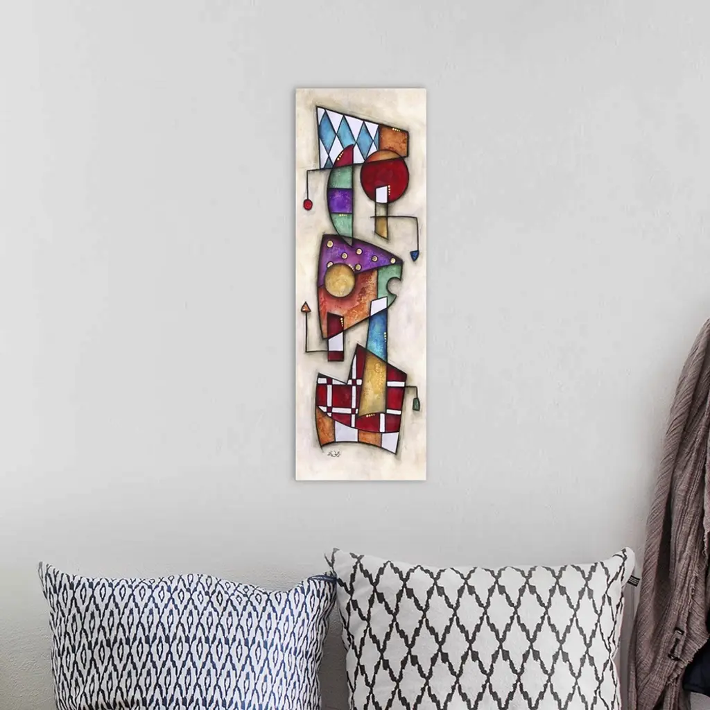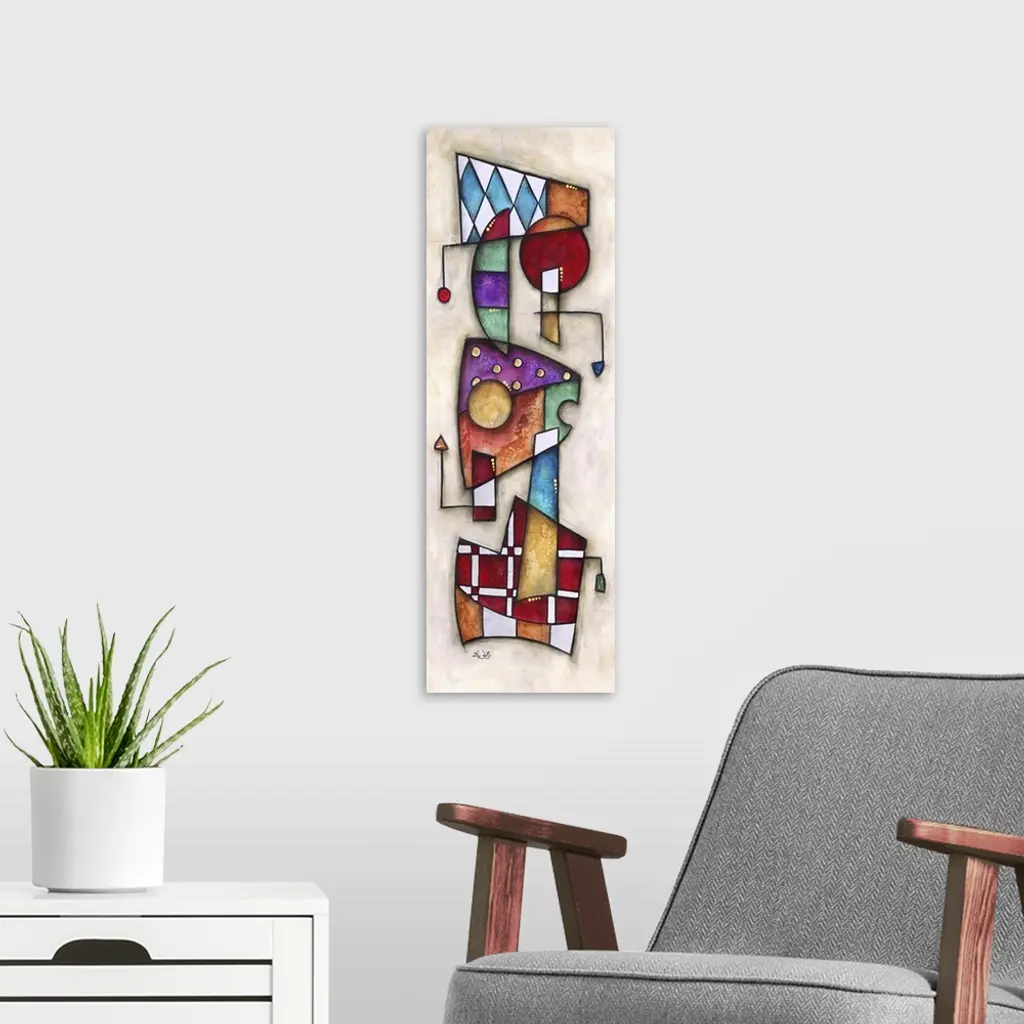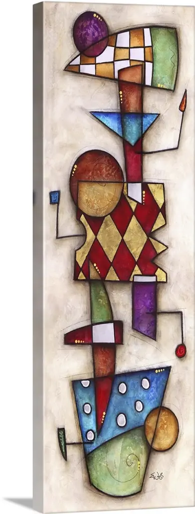 Various shapes with different designs are stacked up on each other in this tall vertical piece.