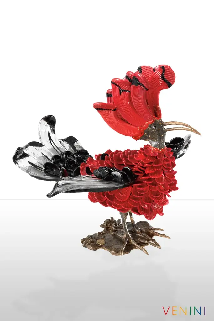 Upupa is an ornament made of glass with a mixed technique. In 1964, the creativity of Toni Zuccheri conceived it with dark wings, ruffled red feathers, and golden leaves adorning its bright Red crown. Its appearance strikes the eye, capturing and holding the viewer’s attention.Toni Zuccheri’s travelling companions: animals have given life and soul to the splendid glass works of this artist. The decoys used by hunters to attract real ducks, normally made from straw, wood and tar, become precious objects when formed from rods of different coloured glass, masterfully ground to shape.Numbered edition for year