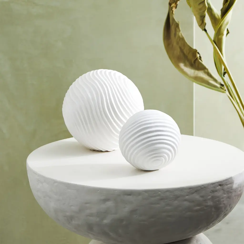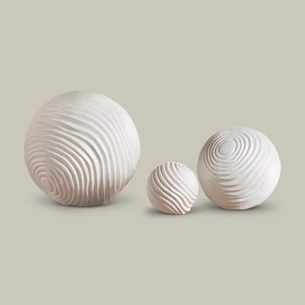 Hand-thrown in a matte ceramic, this sculptural sphere recalls the elemental geometry of Brancusi. Pure, tactile, and resolute, an etched surface invites a dialogue of shadow and reflection, grounding the room in quiet rhythm. Whether placed alone or in a considered composition, it becomes more than decor: an artifact of presence and restraint.
