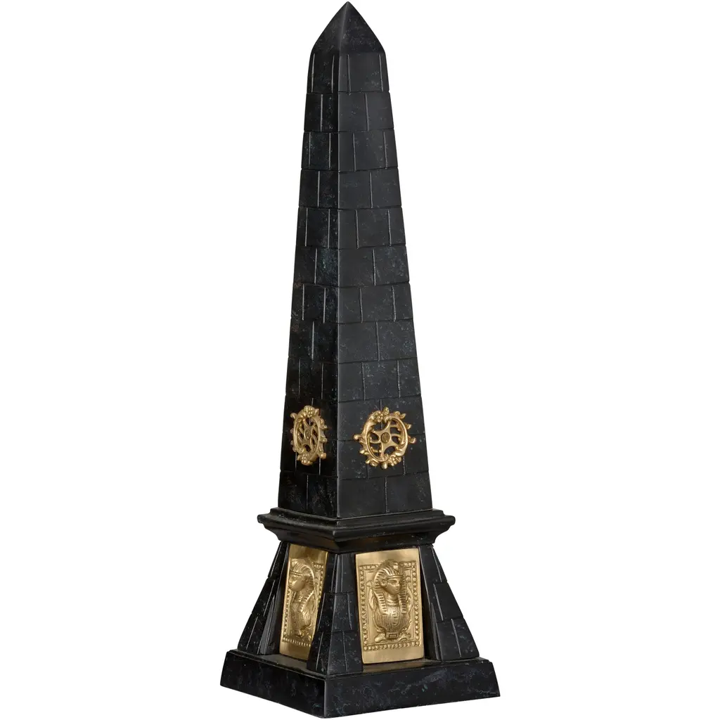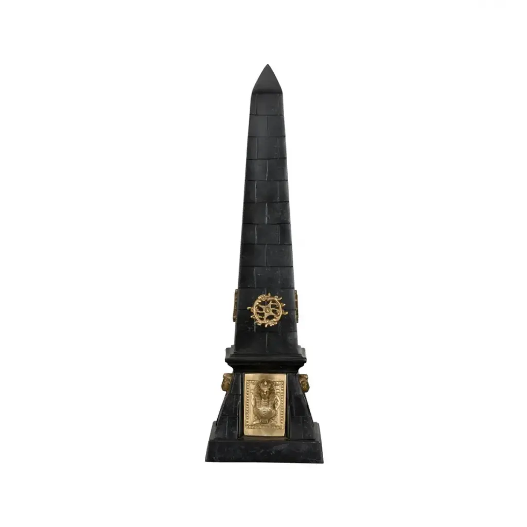 This striking obelisk is crafted from painted metal that mimics the look of stone, giving it a timeless and elegant appeal. The structure is segmented, creating a brick-like effect that enhances its classic aesthetic. The obelisk is adorned with intricate metallic embellishments in a warm brass tone, including ornate gears and shield-like plaques with detailed engravings, lending it an air of sophistication and historical charm. Standing tall on a sturdy base, this obelisk is an excellent decorative piece, ideal for adding a touch of grandeur to any space.