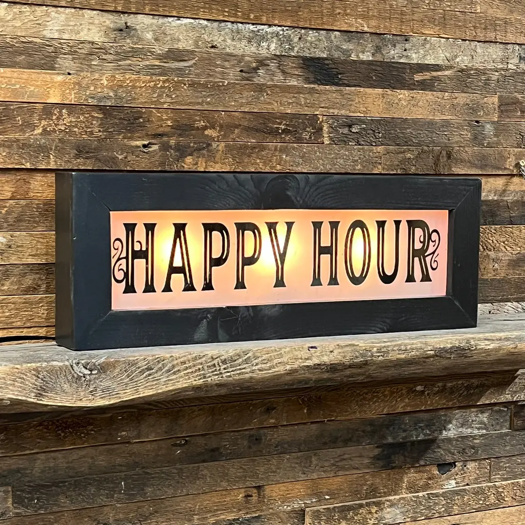 Light up your home with this vintage style light up happy hour sign. Perfect for a home library, office, or a bar cart!