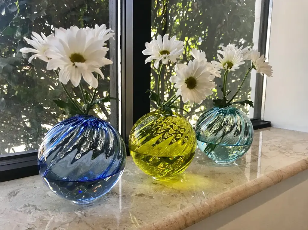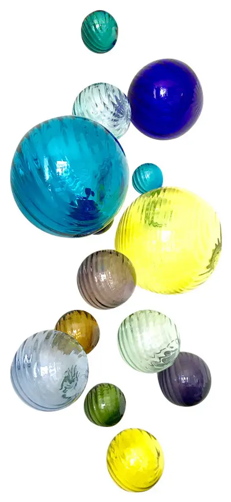 Transform your wall into Art with this large assortment of multi-colored blown glass spheres arranged in any pattern you choose. Each sphere is twirled to give the glass dimension which adds visual intrigue. As shown, this set covers approximately 8 square feet.In your Set of 15 - Twirled Wall Spheres kit, you get:1 - 3" Teal Twirled Sphere1 - 3" Amber Twirled Sphere1 - 3" Cobalt Twirled Sphere1 - 3" Mint Twirled Sphere1 - 3" Aqua Twirled Sphere1 - 3" Olive Twirled Sphere1 - 4.5" Denim Twirled Sphere1 - 4.5" Sky Twirled Sphere1 - 4.5" Lavender Twirled Sphere1 - 4.5" Lemon Twirled Sphere1 - 6" Eggplant Twirled Sphere1 - 6" Mint Twirled Sphere1 - 8" Cobalt Twirled Sphere1 - 8" Aqua Twirled Sphere1 - 10" Lemon Twirled SphereHardware and installation instructions included.All of our blown glass products are made in Mexico from 100% RECYCLED GLASS. They vary somewhat in color and may include tiny air bubbles which are the normal and charming characteristics of artisan workmanship. Every handmade piece is unique! Mounting Spheres On Wall Instructions