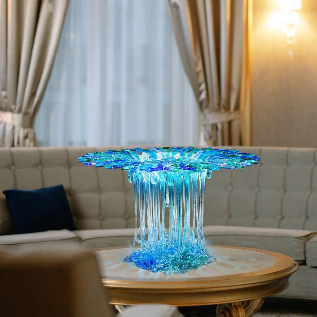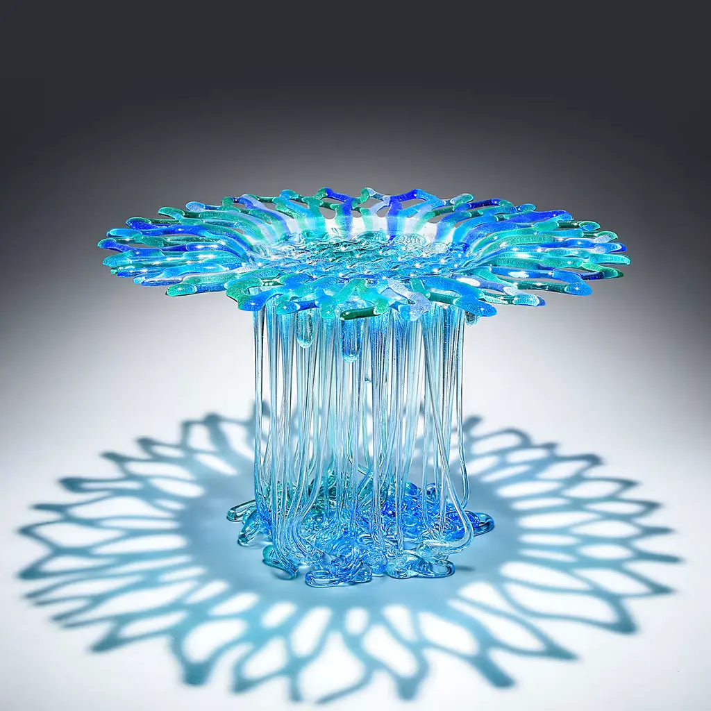 Part of the Meduse Collection ("jellyfish") of striking, sculptural centerpieces, this magnificent design boasts an utterly mesmerizing shape, inspired by the sinuous lines of marine creatures. Superbly handcrafted of Murano glass showcasing bold blue shades, it is carefully packed with a foam board, cardboard and safely placed in a wooden box, please ask the Concierge for further details.