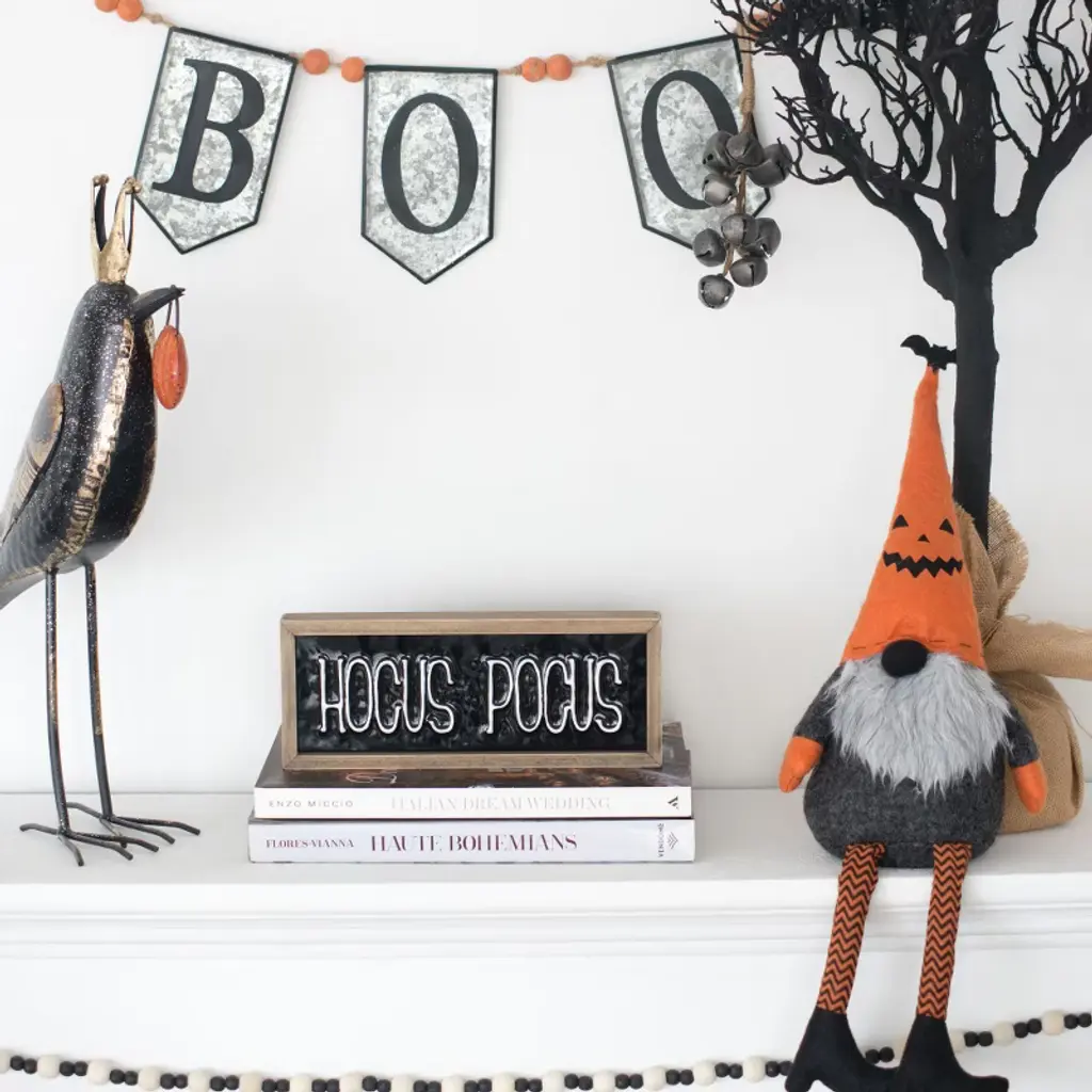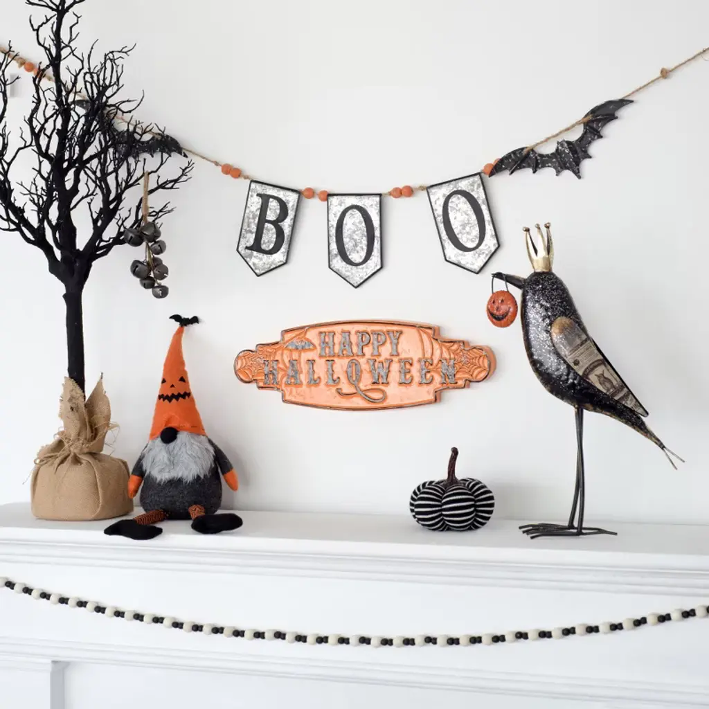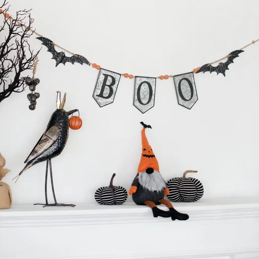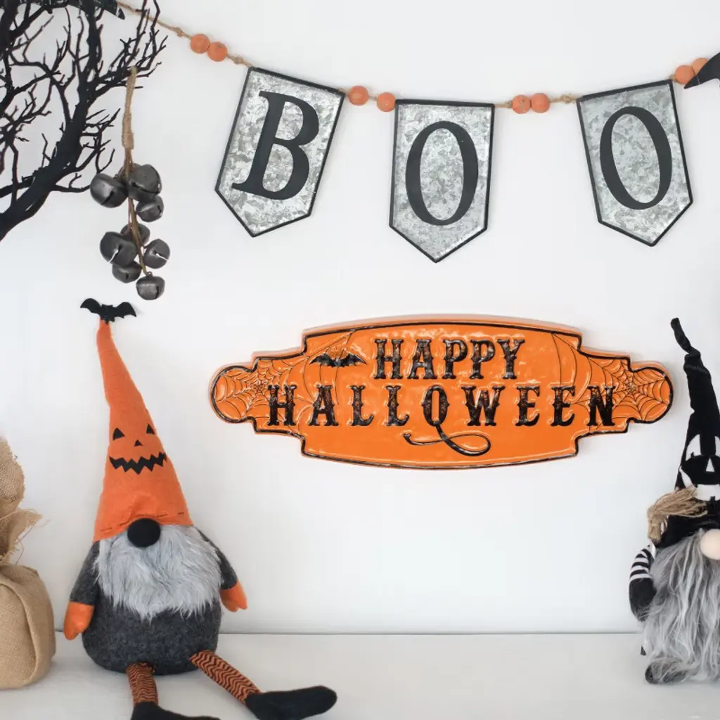 This hauntingly elegant 'Boo' banner creates the perfect spooky atmosphere with its wrought iron construction and intricate bat cutouts that cast eerie shadows. Crafted from a durable blend of 90% iron with 5% fir wood accents and 5% natural rope detailing, this decorative piece combines rustic charm with gothic appeal. The distressed metal lettering and flying bat silhouettes create dynamic visual interest when displayed on mantels, walls, or above doorways. The natural variations in the iron finish give each banner unique character, making it a distinctive addition to your Halloween decor. Perfect for creating a haunted house vibe in living rooms, dining areas, or entryways, this sturdy yet lightweight banner withstands seasonal use while maintaining its spooky aesthetic. The neutral metallic tones blend seamlessly with various color schemes, allowing for versatile styling options. Designed to make a dramatic statement, this handcrafted banner will become a cherished part of your Halloween traditions for years to come.