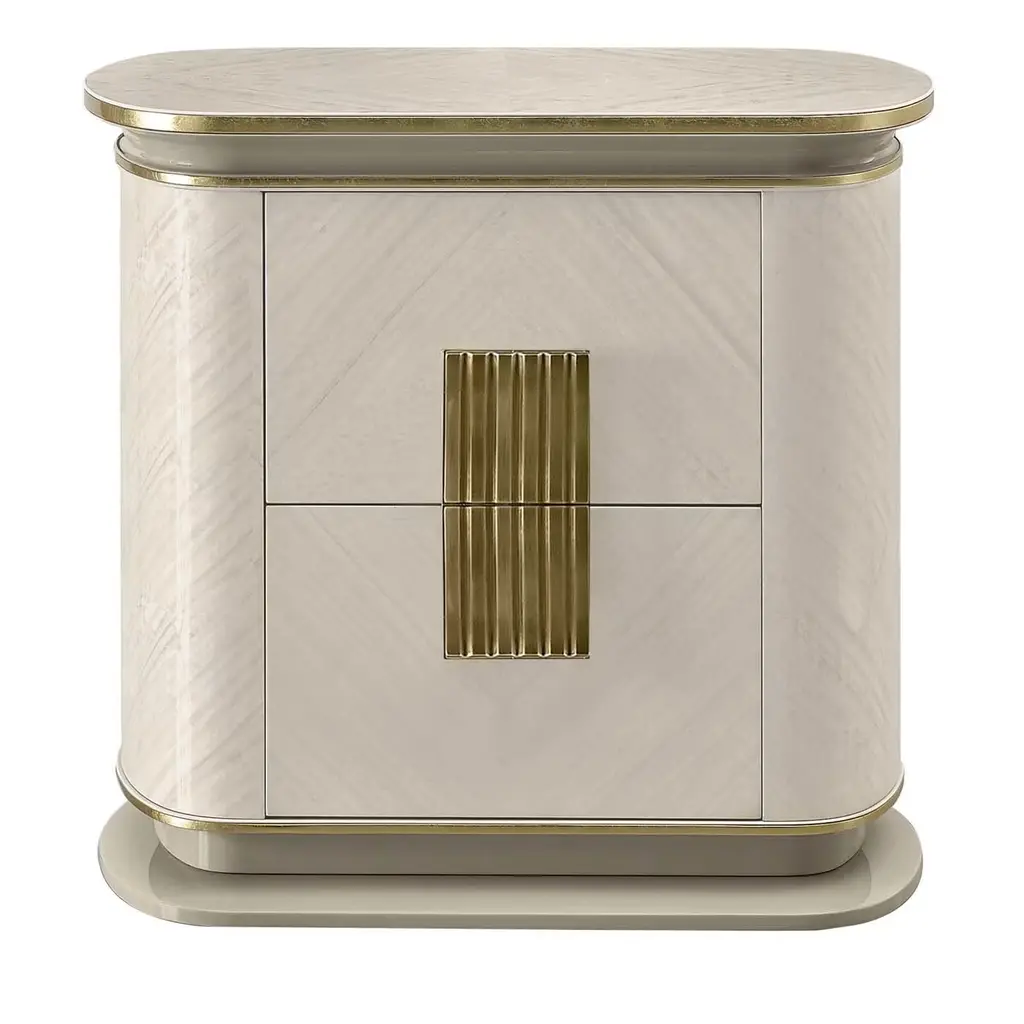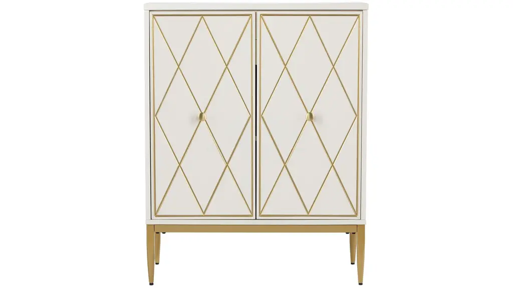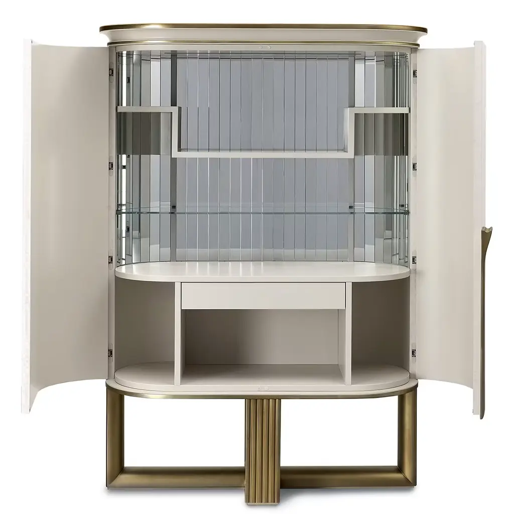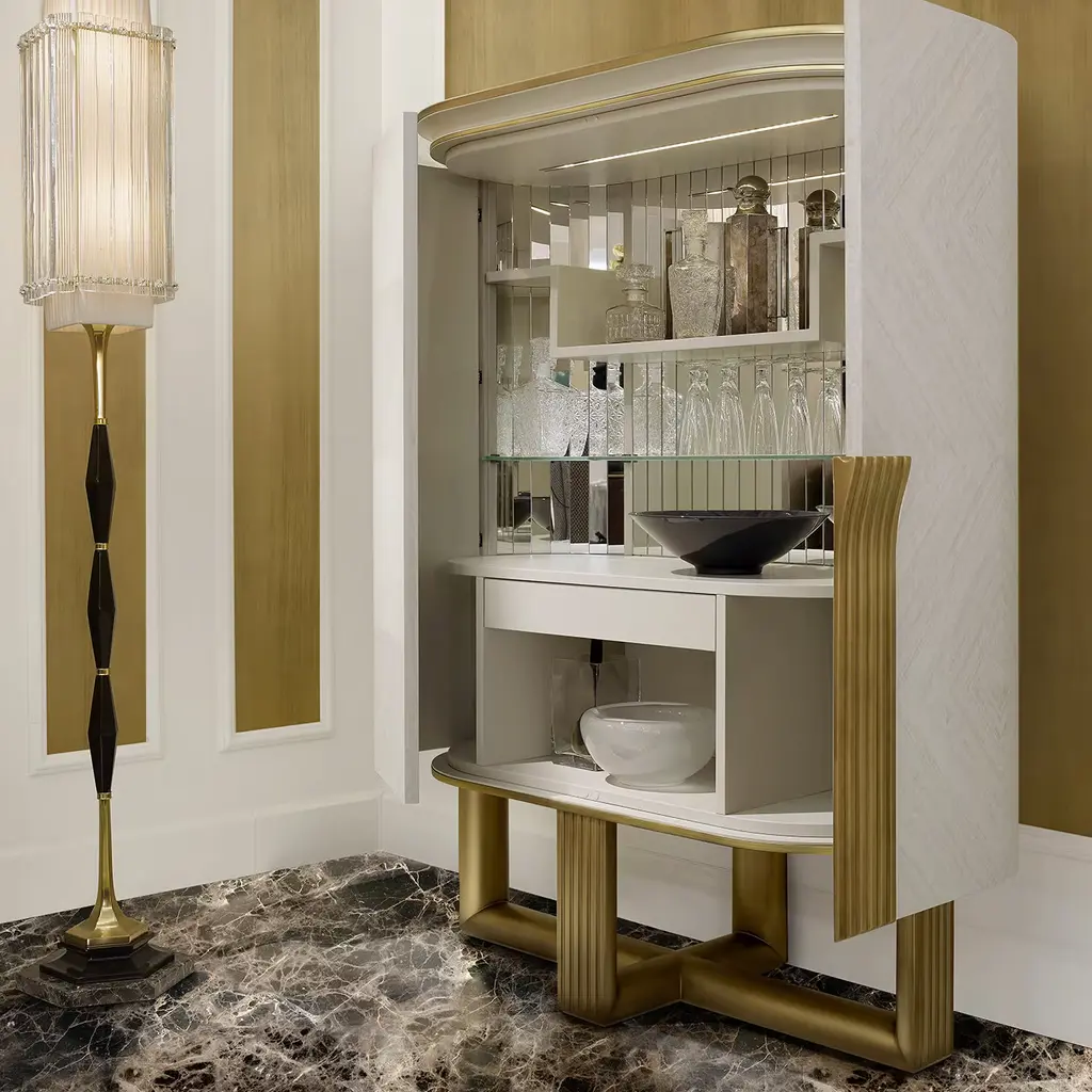This bar cabinet boasts a plush and sophisticated allure in its combination of white and golden hues enhancing its sturdy silhouette. The white eucalyptus-veneered MDF and plywood structure is enriched with burnished brass-finished details, and features inside wooden drawers and glass shelves that provide functional storage for bar accessories and glasses. This bar cabinet is available also in rosewood, please consult the Concierge for details and pricing options.