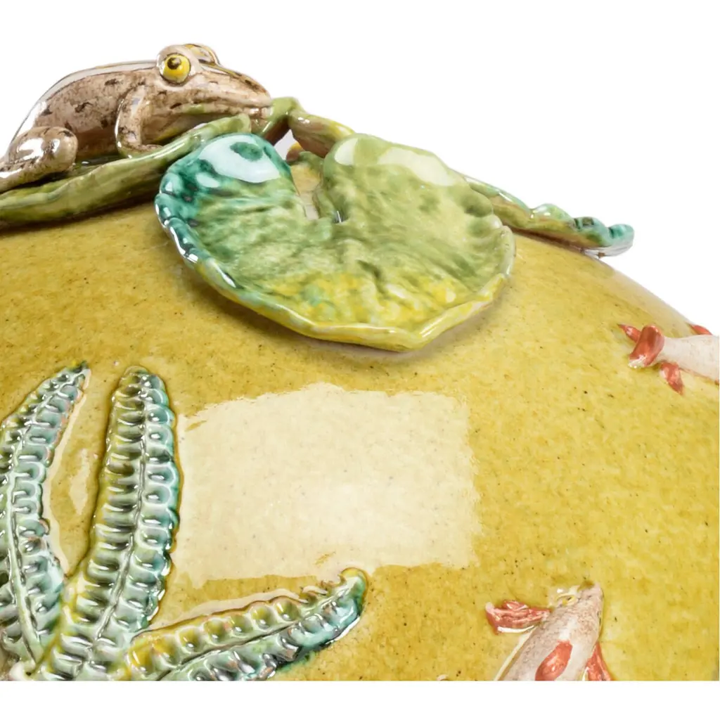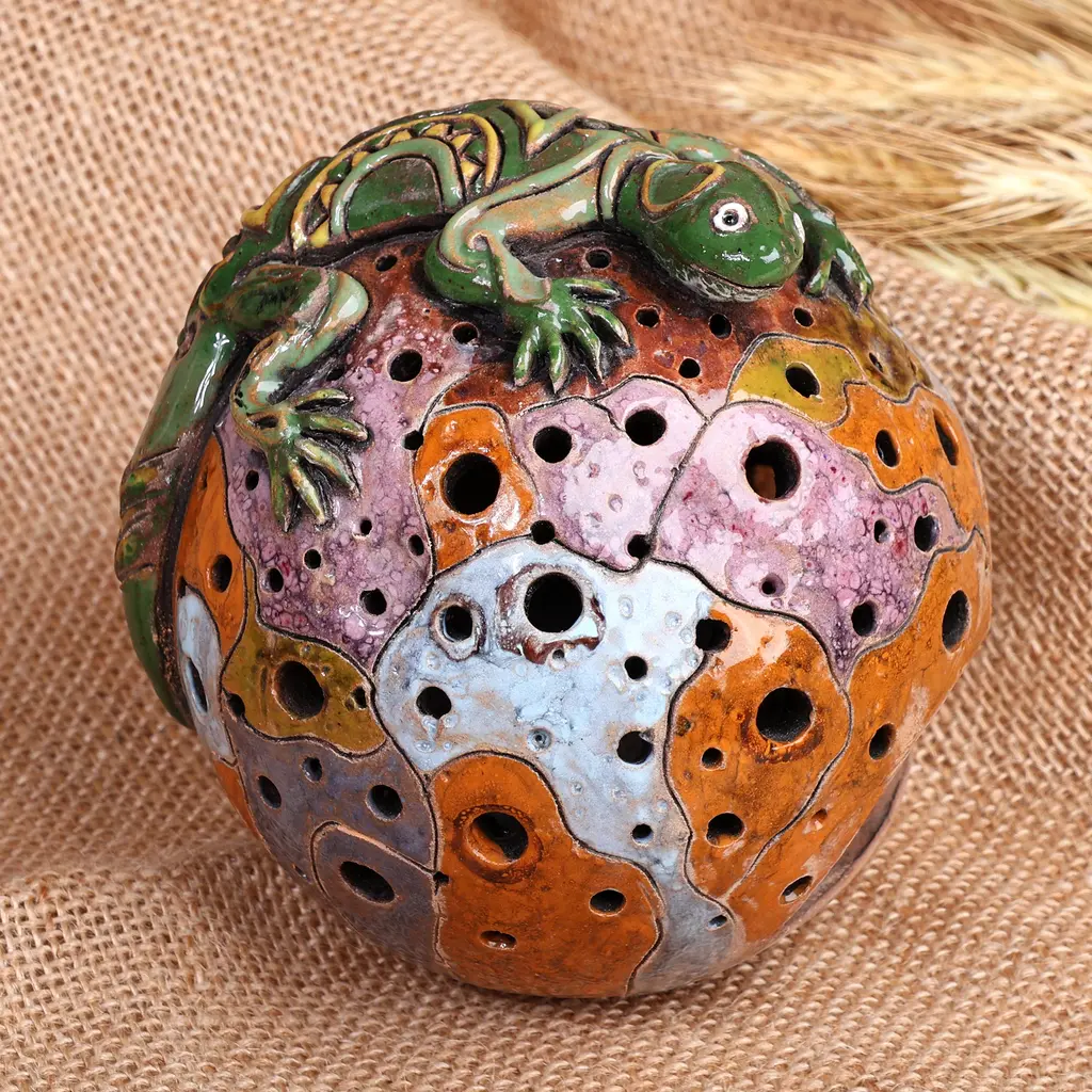 GREEN RIVER SPHERE. HAND SCULPTED CERAMIC SPHERE DECORATED WITH A FROG, SNAKE, FISH AND FLOWERS IN GLAZE COLORS FROM NATURE.