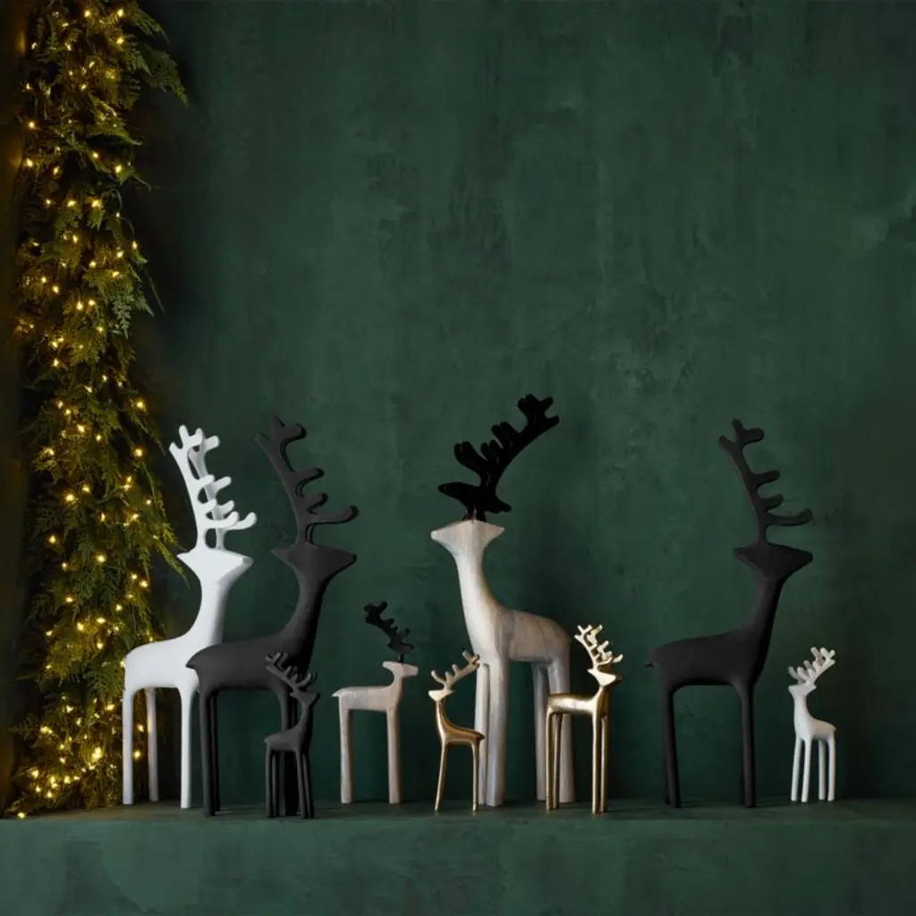 Our best-selling reindeer sculptures get a new Scandinavian-inspired look. Crafted by hand with a modern, abstracted silhouette and flowing curves in pale wood, the medium reindeer gazes across the winter landscape, searching for delicious moss, lichen and ferns. The caribou's elongated legs and rounded cuteness add a playful element to holiday decor. Group with other sizes of our other exclusive reindeer sculptures to create a miniature herd on your fireplace mantel, buffet or dining room tablefor an extra touch of wintry wonder, sprinkle the scene with fluffy faux snow. Carved out of renewable solid mango wood, from trees no longer producing fruit, our hand-polished reindeer is topped with black aluminum antlers.By choosing FSC ®-certified furniture, you are supporting responsible management of the world's forests.