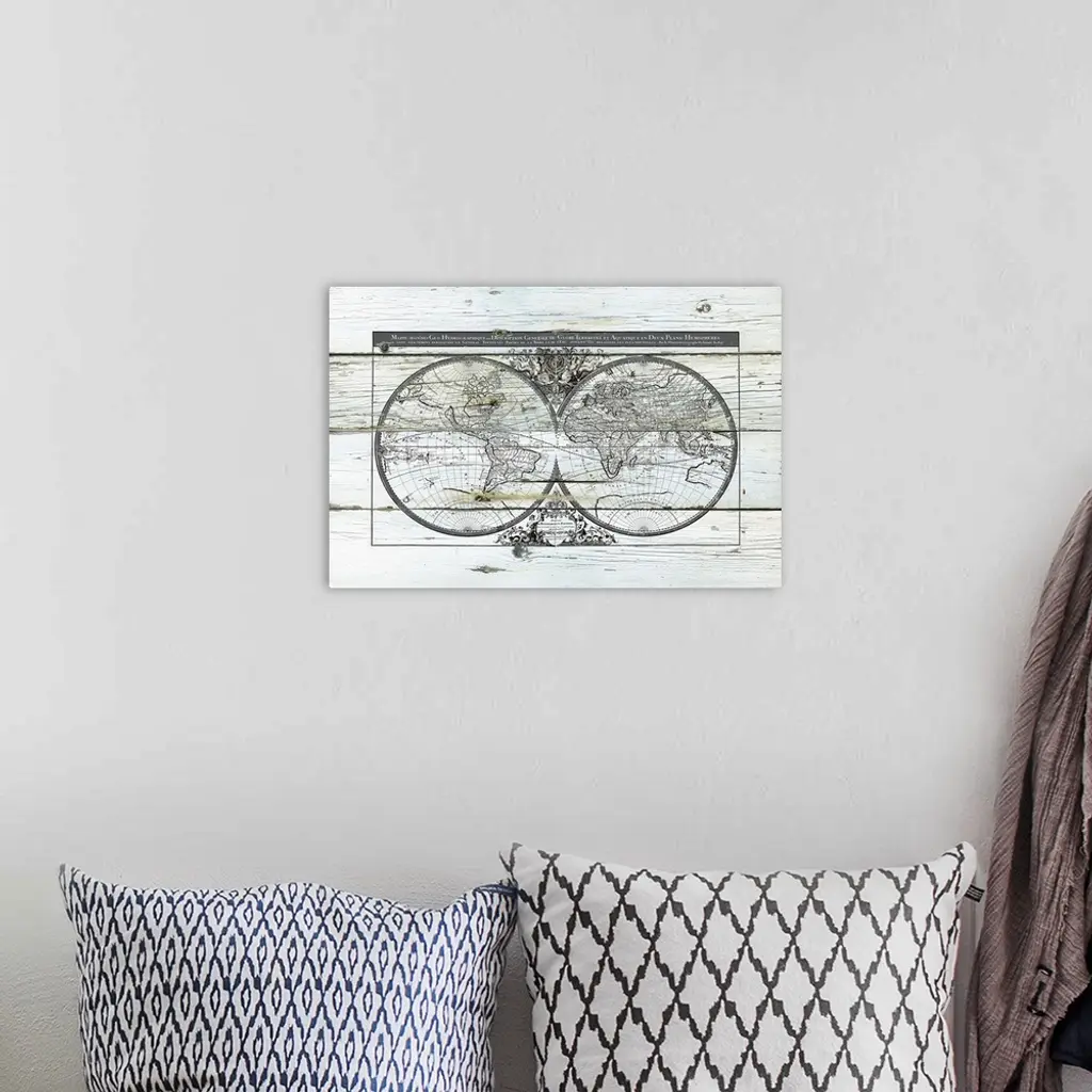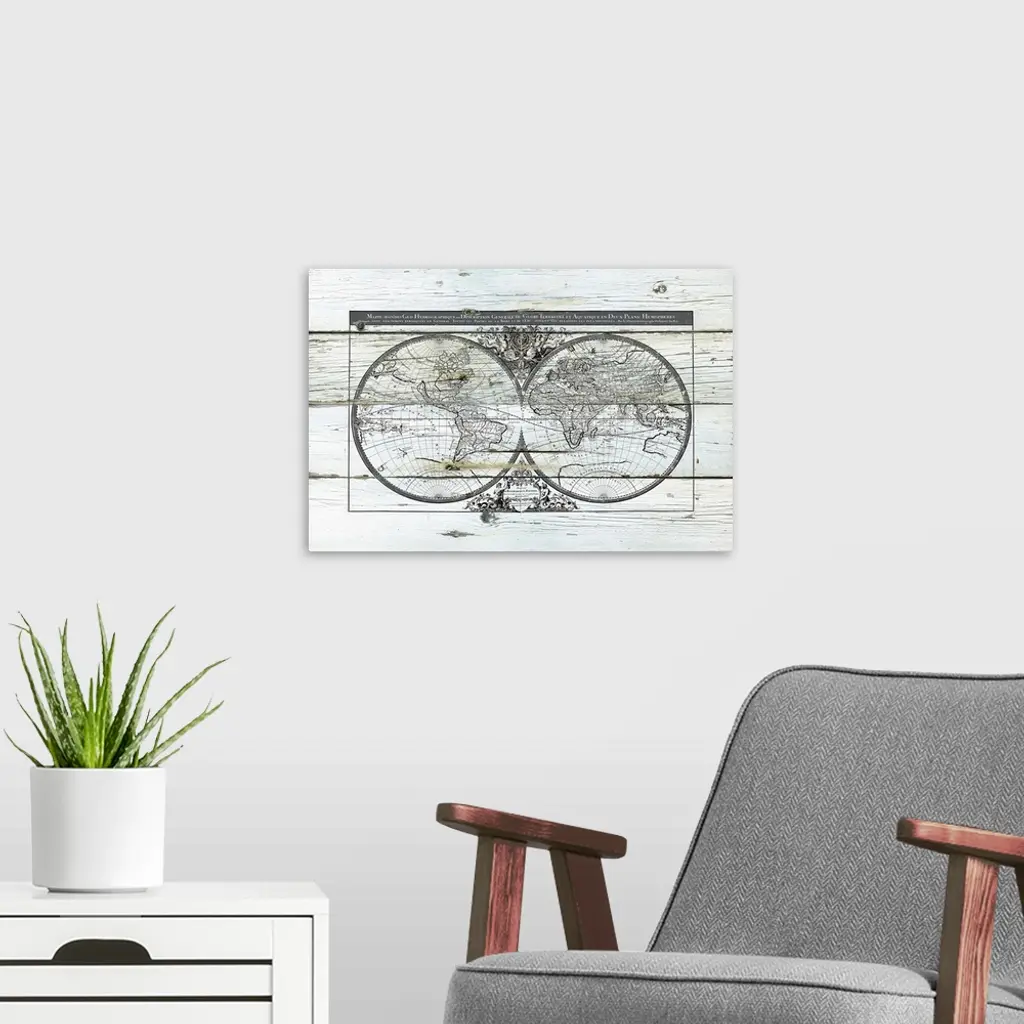 Illustration of the World Map in hemispheres on a distressed wood paneled background.