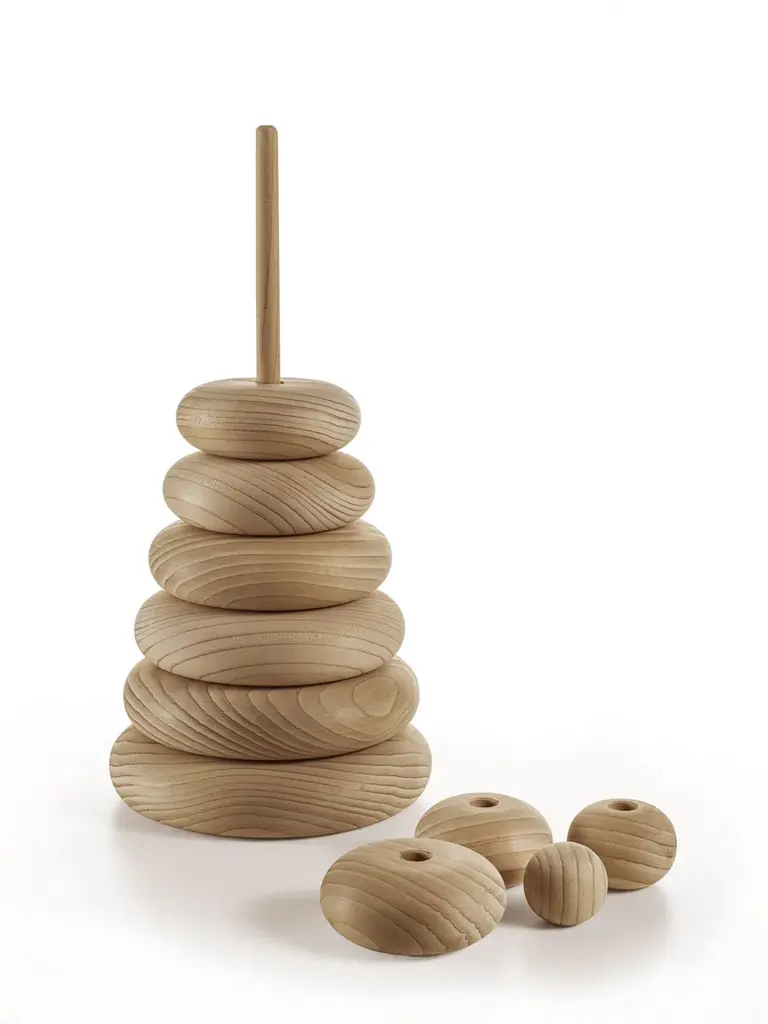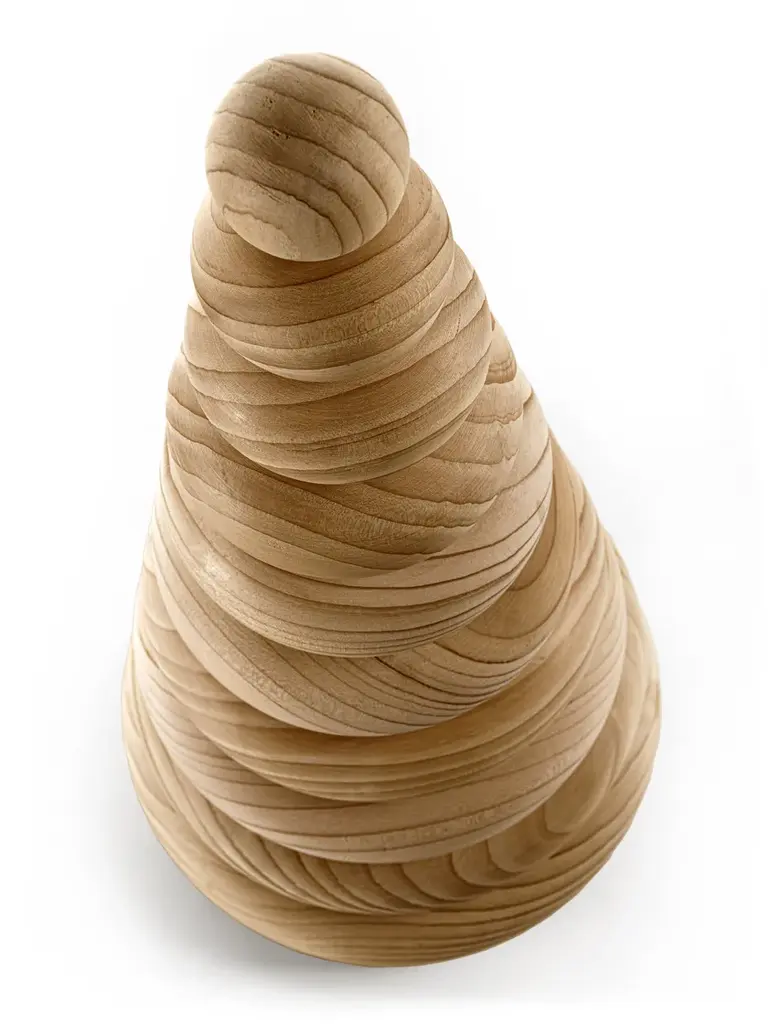 XMAS_DLO is a Christmas cedarwood decorative object.Taking inspiration from a well-known children’s game, the traditional Christmas tree is reinterpreted; consisting of 10 rings of equal thickness, but decreasing in width from bottom to top, stacked on a central structure.The Christmas season is the perfect opportunity to express a bit of madness and let thejoy of life enter the house. Riva 1920, thanks to the creative inspiration of some architects and designers, reinterprets the traditional symbol of Christmas; soft, captivating, geometric or linear shapes sculpt scented cedar wood giving life to a collection that makes the perfect Christmas atmosphere. The small pine trees are also flanked by the elegant wooden balls made of thousand- year-old Kauri wood; tradition, passion and exclusivity also for this time of year.