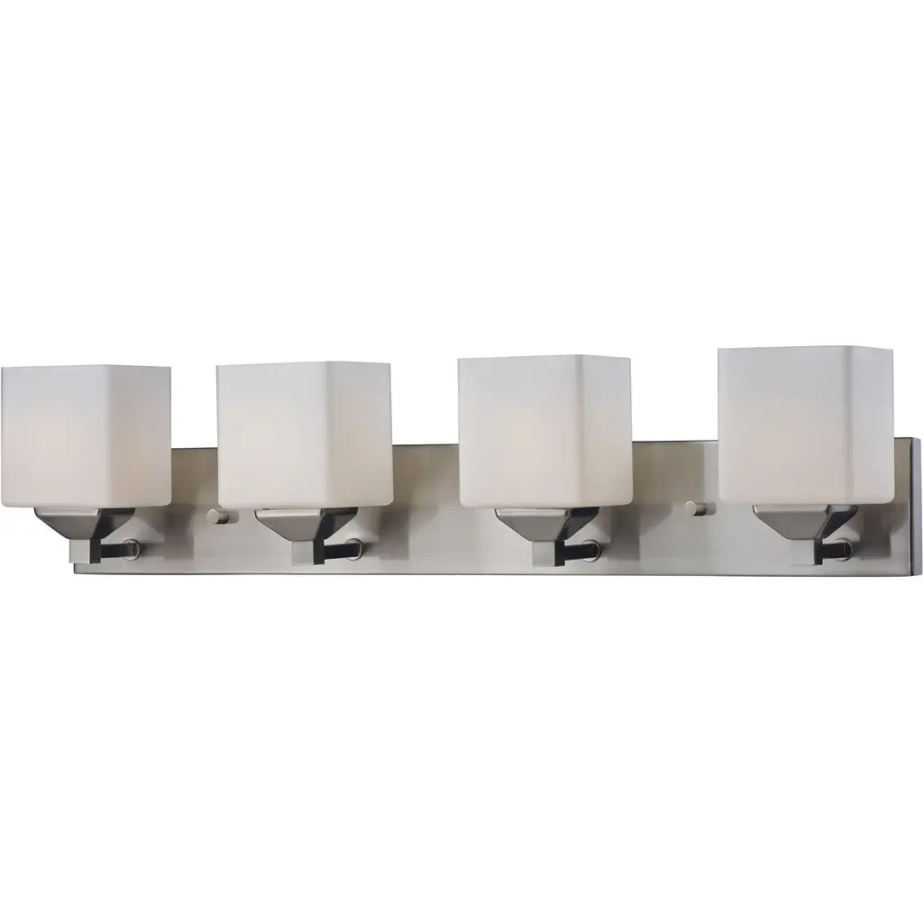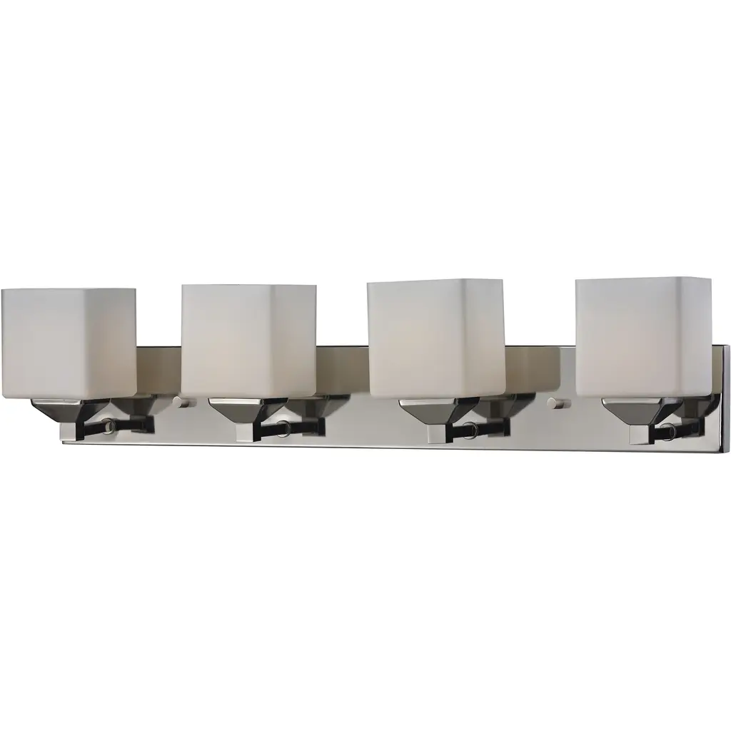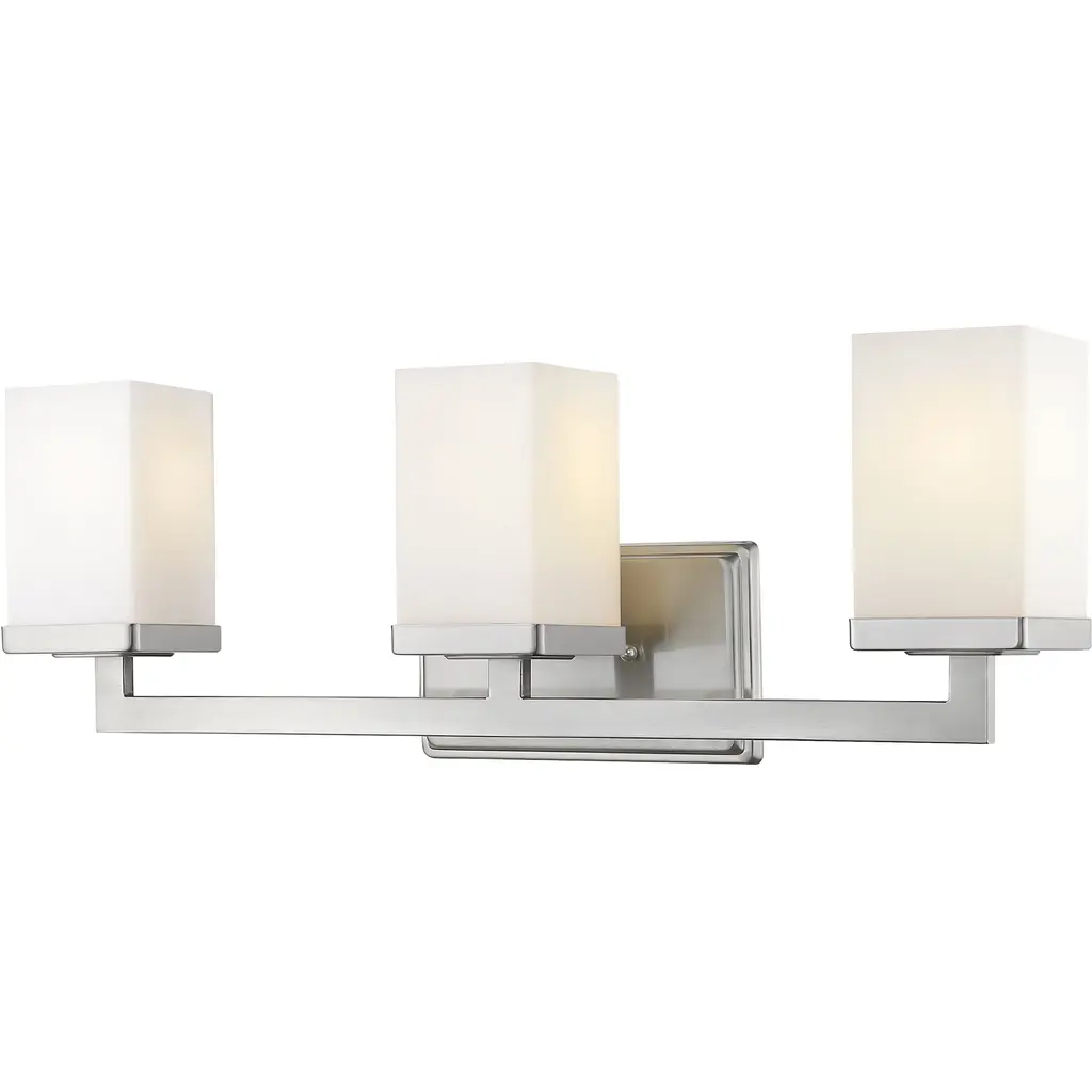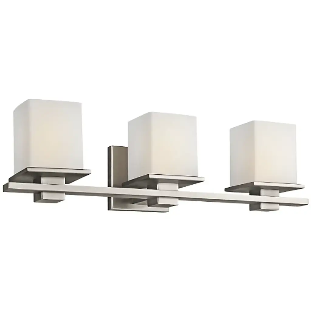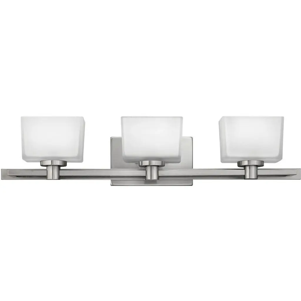 Rectangular shaped hardware and complimenting cube shades create a straight contemporary look. This three light vanity is finished in chrome, and includes matte opal shades. This fixture will add a touch of contemporary to any decor. Bathroom/Powder Room Mounting Direction: Up/Down Shade Included: Yes Dimmable: Yes Material: Glass, Finish Color: Chrome, Width: 24", Height: 6.75", Length: 6", Depth: 6", Backplate Width: 4.25", Backplate Length: 22", Lamping Type: Incandescent, Number Of Bulbs: 3, Wattage: 100 Watts, Dimmable: Yes, Moisture Rating: Damp Rated
