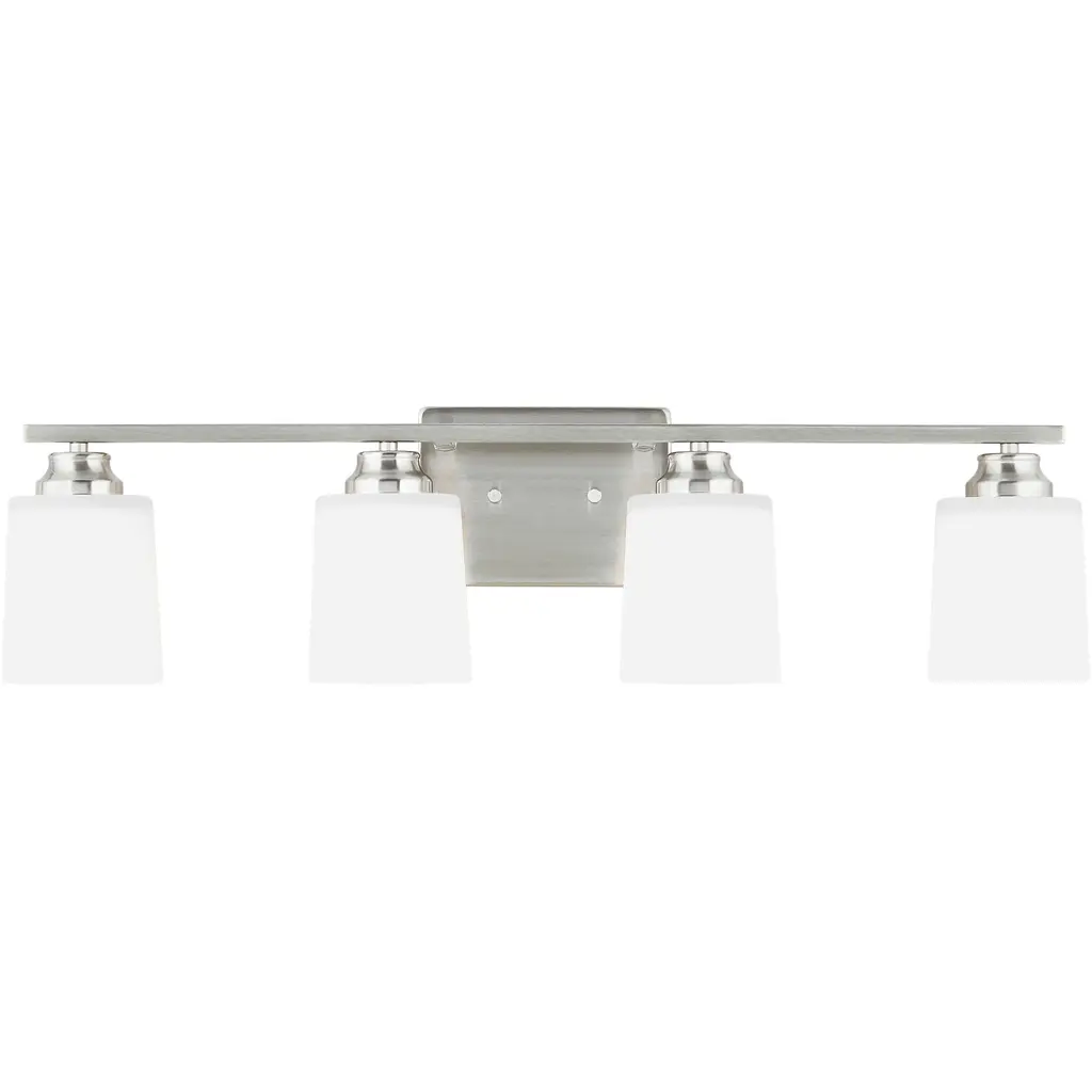 Rectangular shaped hardware and complimenting cube shades create a straight contemporary look. This four light vanity is finished in brushed nickel, and includes matte opal shades. This fixture will add a touch of contemporary to any decor. Bathroom/Powder Room Mounting Direction: Up/Down Shade Included: Yes Dimmable: Yes Material: Glass, Finish Color: Brushed Nickel, Width: 30", Height: 6.75", Length: 6", Depth: 6", Backplate Width: 4.25", Backplate Length: 30", Lamping Type: Incandescent, Number Of Bulbs: 4, Wattage: 100 Watts, Dimmable: Yes, Moisture Rating: Damp Rated