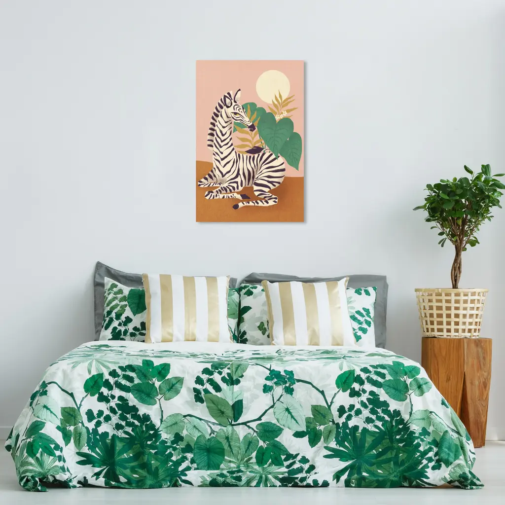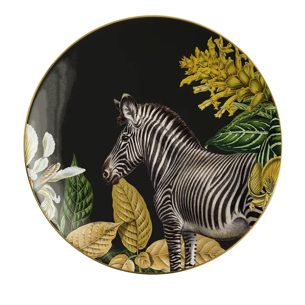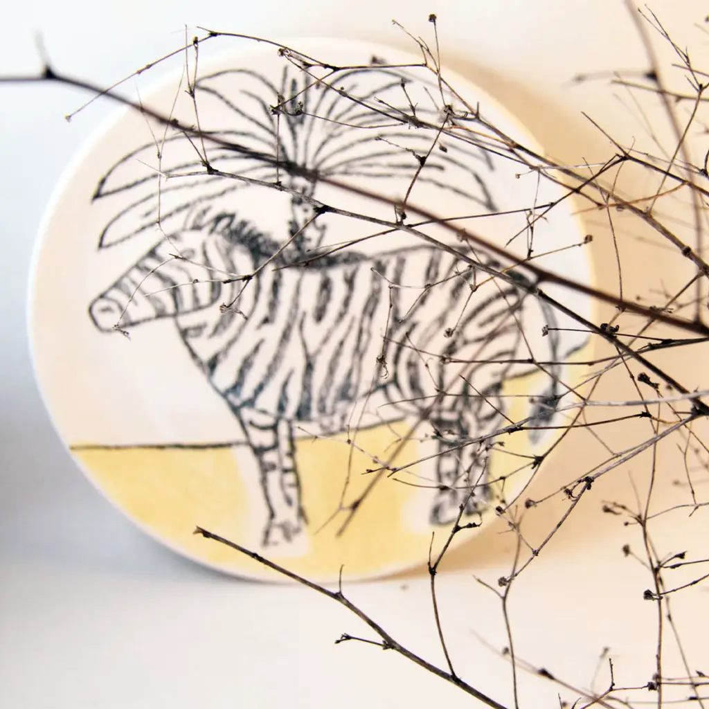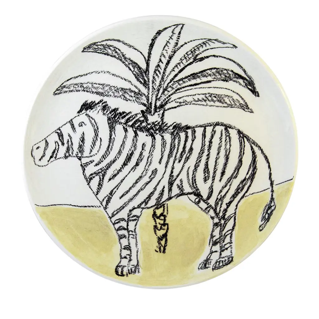 This exquisitely handcrafted ceramic plate will bring a charming artistic touch to a modern kitchen or den especially when displayed with other pieces by the same designer or matched with an arrangement of succulents to accentuate its exotic motif. print for a cohesive ensemble. Crafted of white clay and painted by hand, this plate depicts a black and white zebra and palm tree in a sandy landscape, the clear details and brilliant colors obtained using the ingobbio technique through double firing (at 1000°C and 930°C) to achieve the lovely glossy finish.