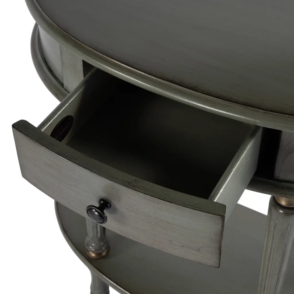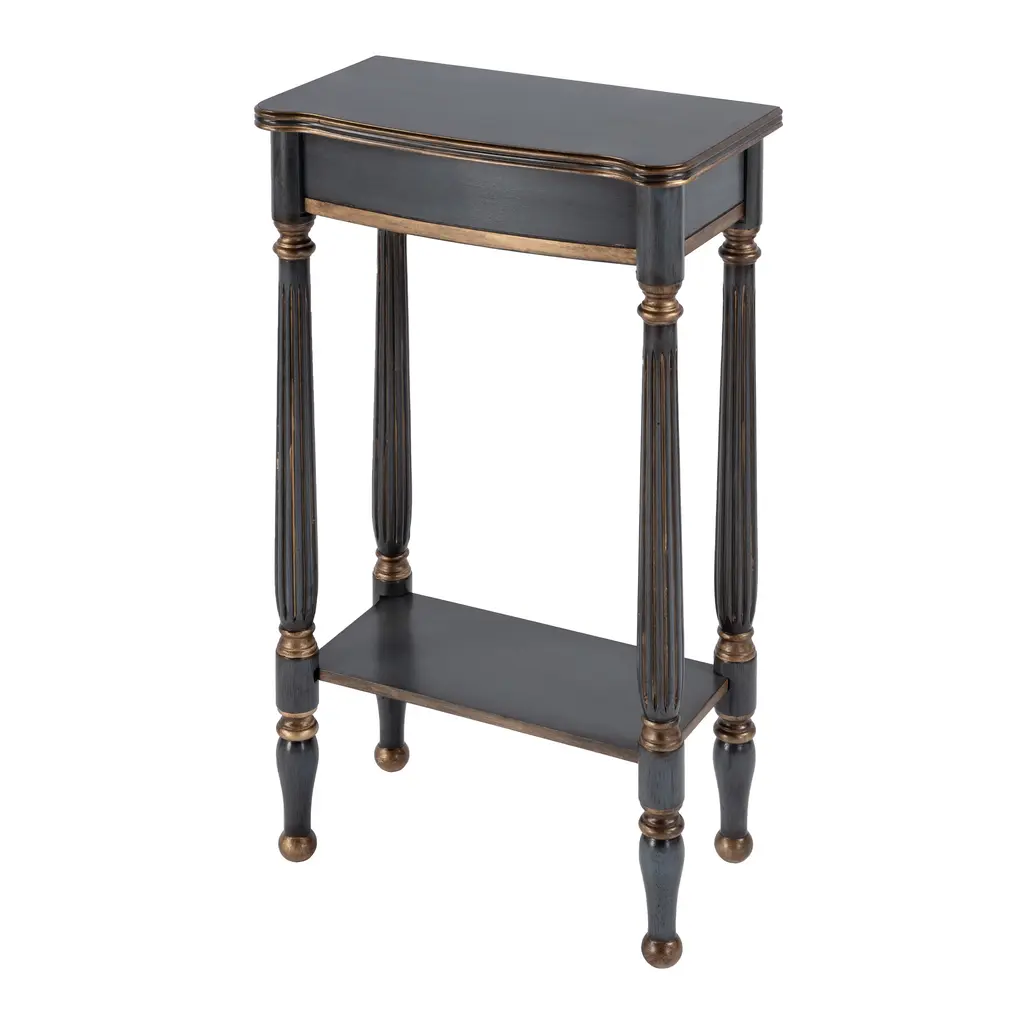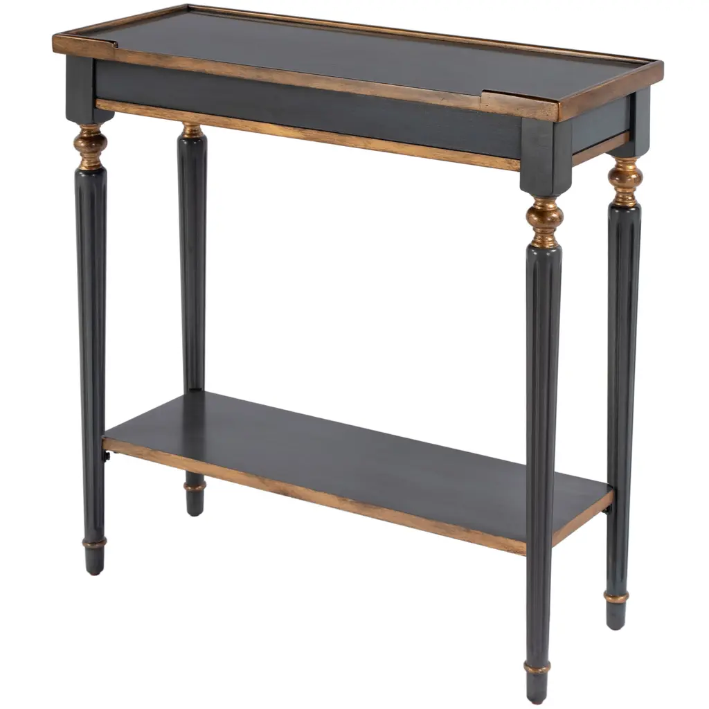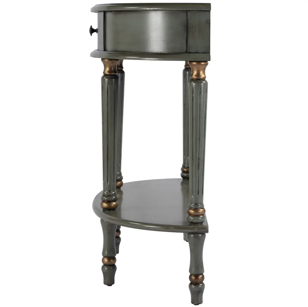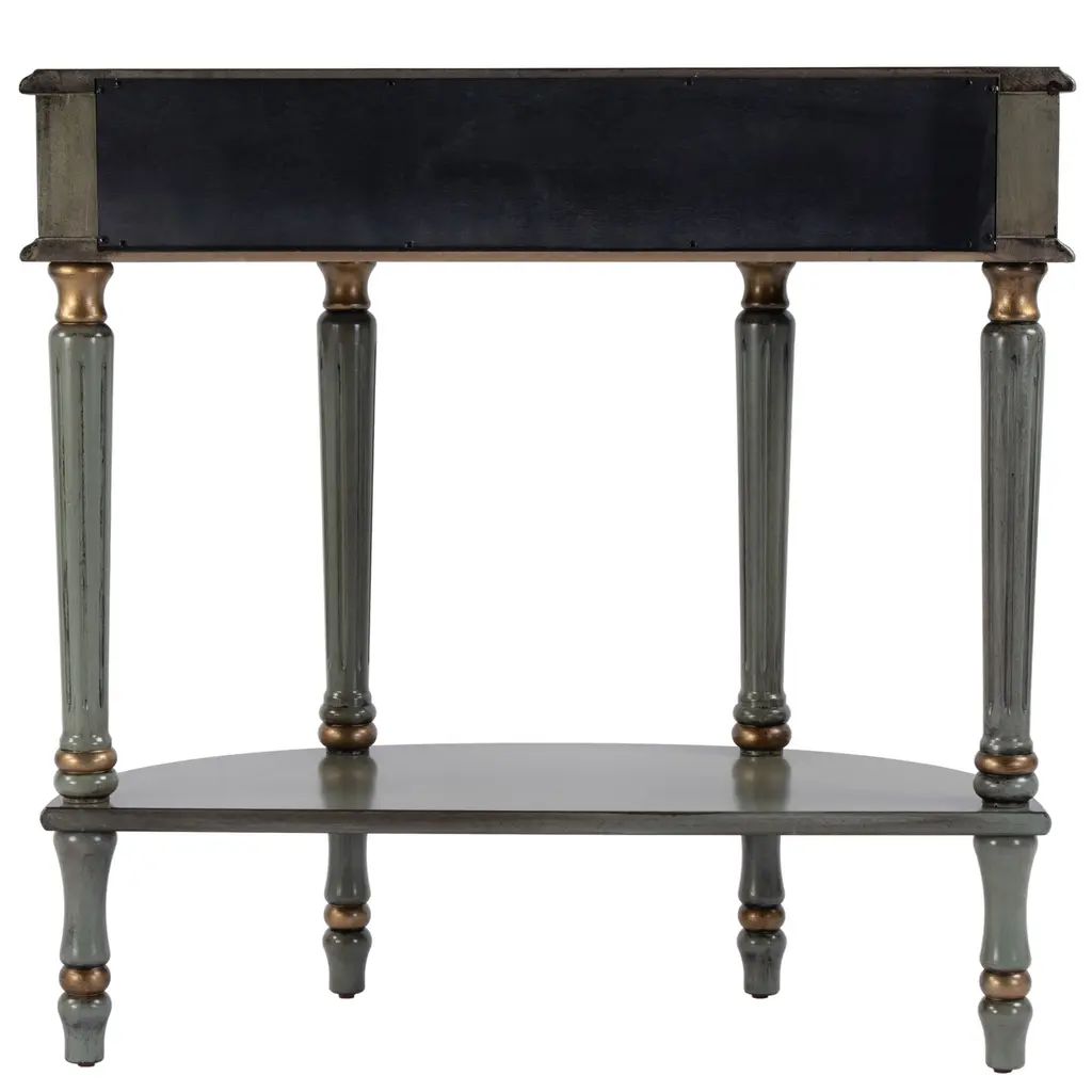 The Ambrose 31.5 in. W Demilune Wood Hand Painted 1 Drawer Console Table with Lower Open Shelf exudes elegance by blending classic charm with a sleek, modern finish. Its unique half-circle shape is designed to fit seamlessly in entryways or against walls, offering both style and functionality to compact spaces. A single drawer provides discreet storage, while the fixed lower shelf offers additional space for display or storage. The slender, fluted legs and subtle accents add a touch of sophistication, making this table a refined addition to traditional or transitional decor.