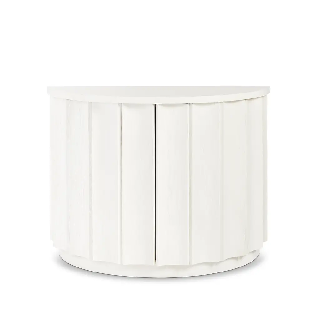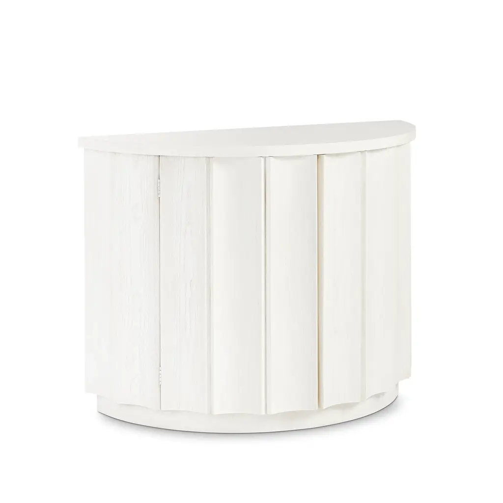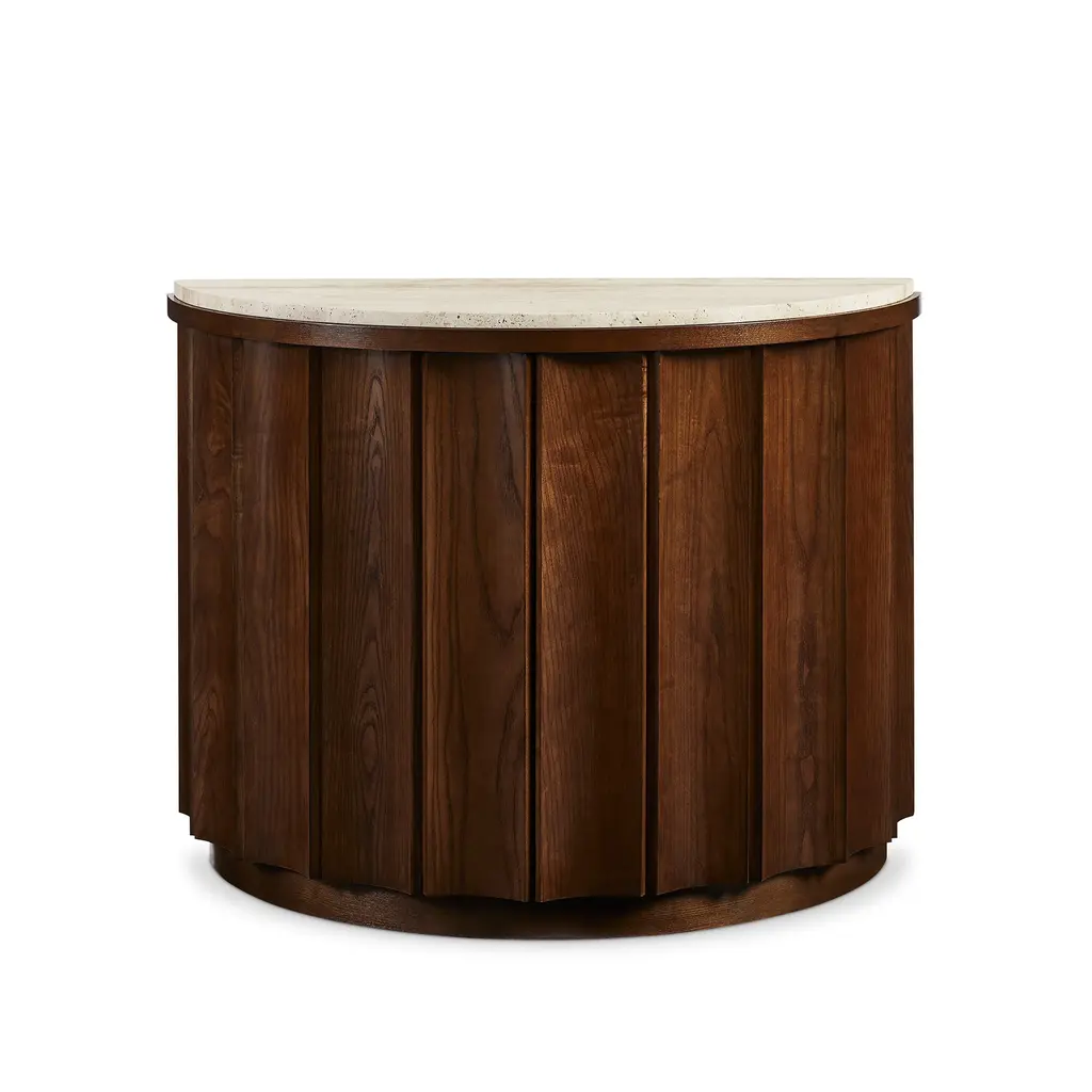 The epitome of transitional style, the Bridgeton Demilune has a contemporary shape combined with mid century modern elements that pair with the rich brown or crisp white wood construction. The front double doors are seamless with the panelling across the entire front of the piece, and hide ample storage. The Carob Brown model also includes a tan Travertine Stone top, adding additional texture. Ships In 10-12 Weeks Ships In 10-12 Weeks Half moon top Seamless front doors Sandstone or Carob Brown finish As Shown Finish: Sandstone, Carob Brown This image is for illustrative purposes only. The colors shown are accurate within the constraints of lighting, photography, and the color accuracy of your screen.