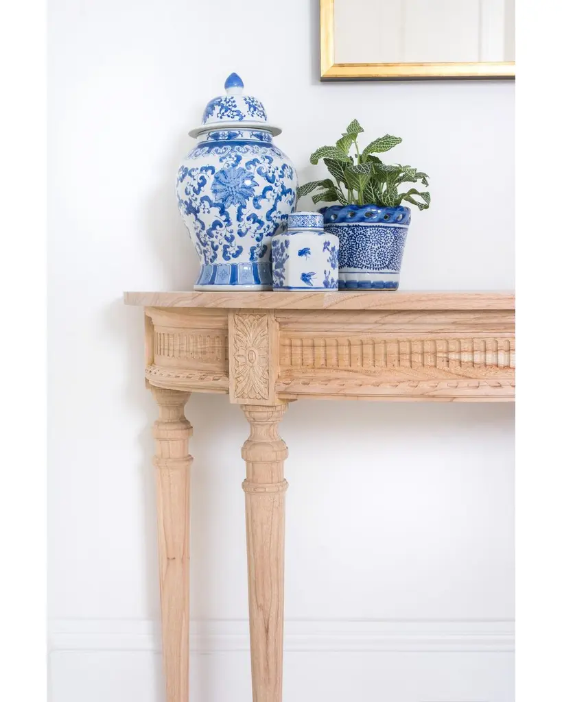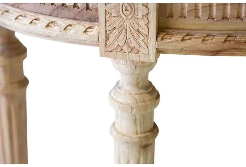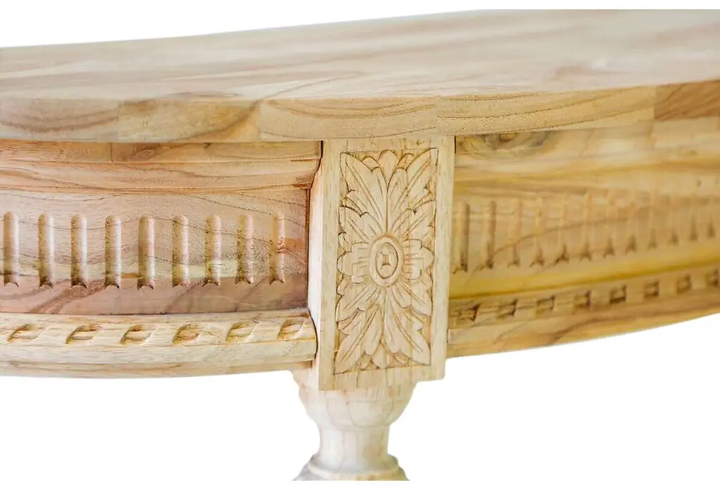 Masterfully carved of mindi wood, this demilune console radiates Louis XVI-inspired allure with ballerina legs, floral medallions, and fluted frieze. We love how the wood shows off a swirling, organic grain.