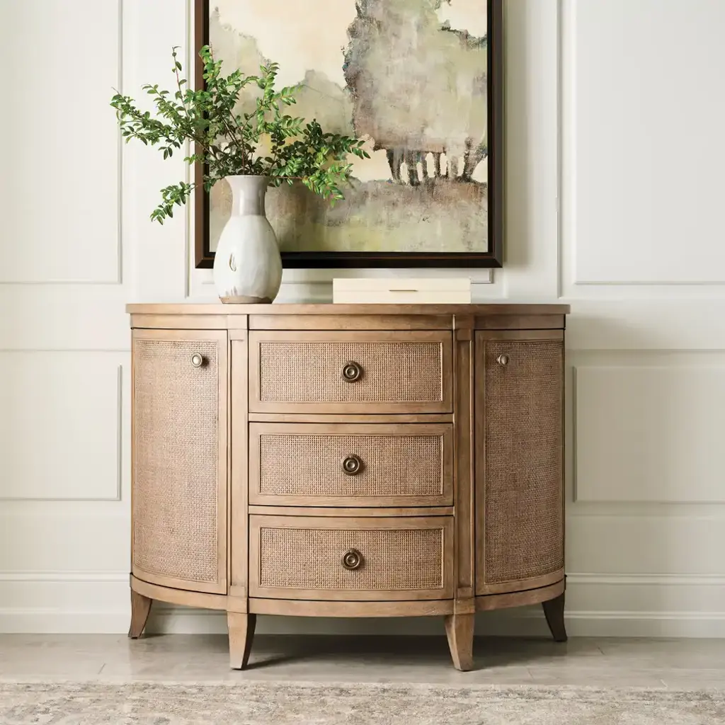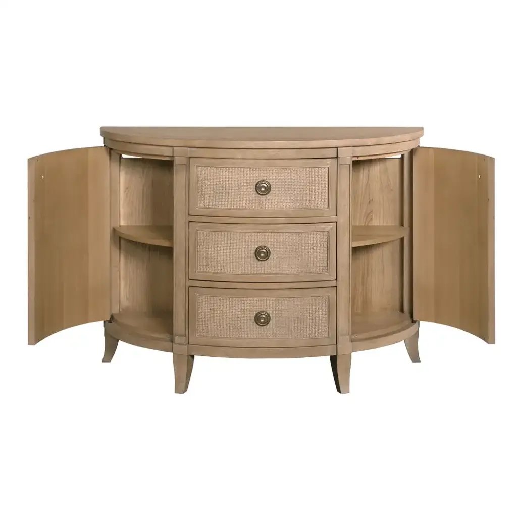 Add distinctive style to your space with the Woodfield Demilune Chest from the refined Chastain collection. This elegant curved-front piece showcases beautiful elm veneers finished in a soft light stain. The versatile design offers exceptional storage with three spacious drawers perfect for linens, clothing, or personal items, while two doors conceal additional compartments. Inside, two wood shelves provide organized storage for various household essentials. The demilune silhouette creates an eye-catching focal point that works beautifully in entryways, hallways, or living areas. Built with thoughtful attention to detail, this chest features adjustable levelers to ensure perfect stability on uneven floors.