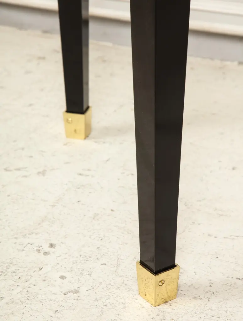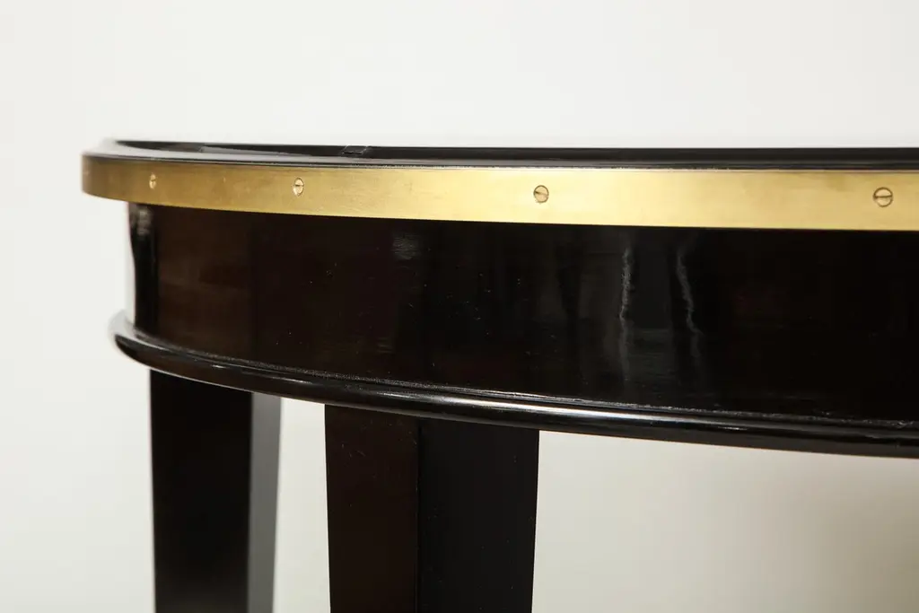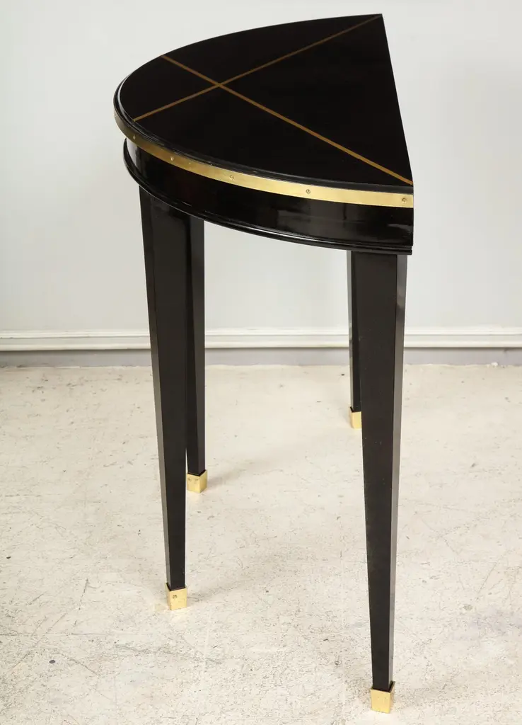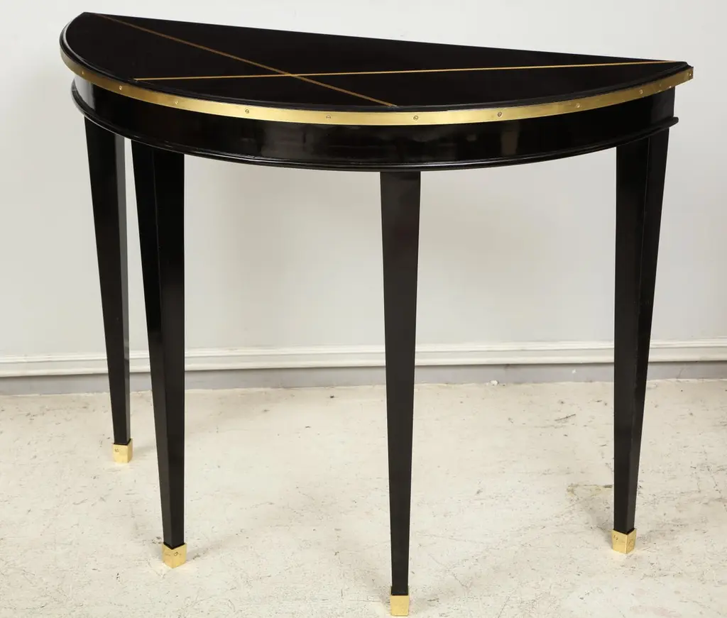 Custom Pair Of Ebonized Demilune Consoles With Inlaid Brass Top