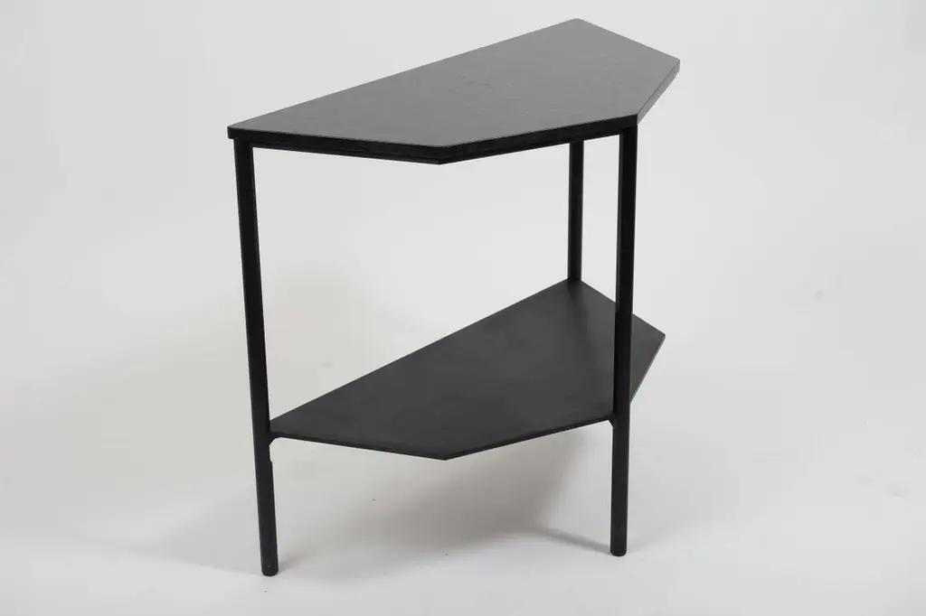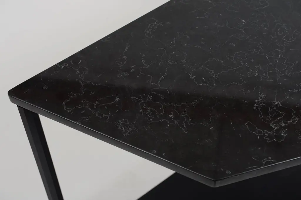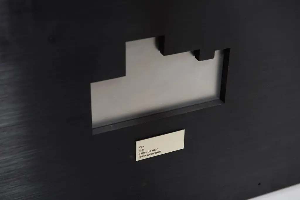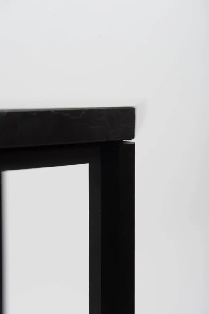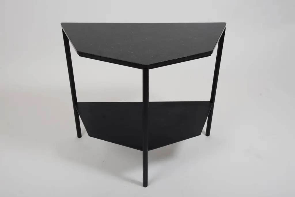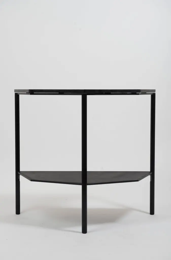 This half-octagon shaped console is a contemporary take on the demilune entry console. Octagon-shaped legs are cnc-milled out of square aluminium solid bar, and hand brushed and anodized in satin black. Legs are connected via custom milled aluminium braces and digitally-cut marble top sits on top of the aluminium base. Made originally for executive restroom of Cummins Engine Company in Columbus, Indiana with inspiration coming from octagon-shaped pillars found throughout this Kevin Roche designed corporate headquarters.