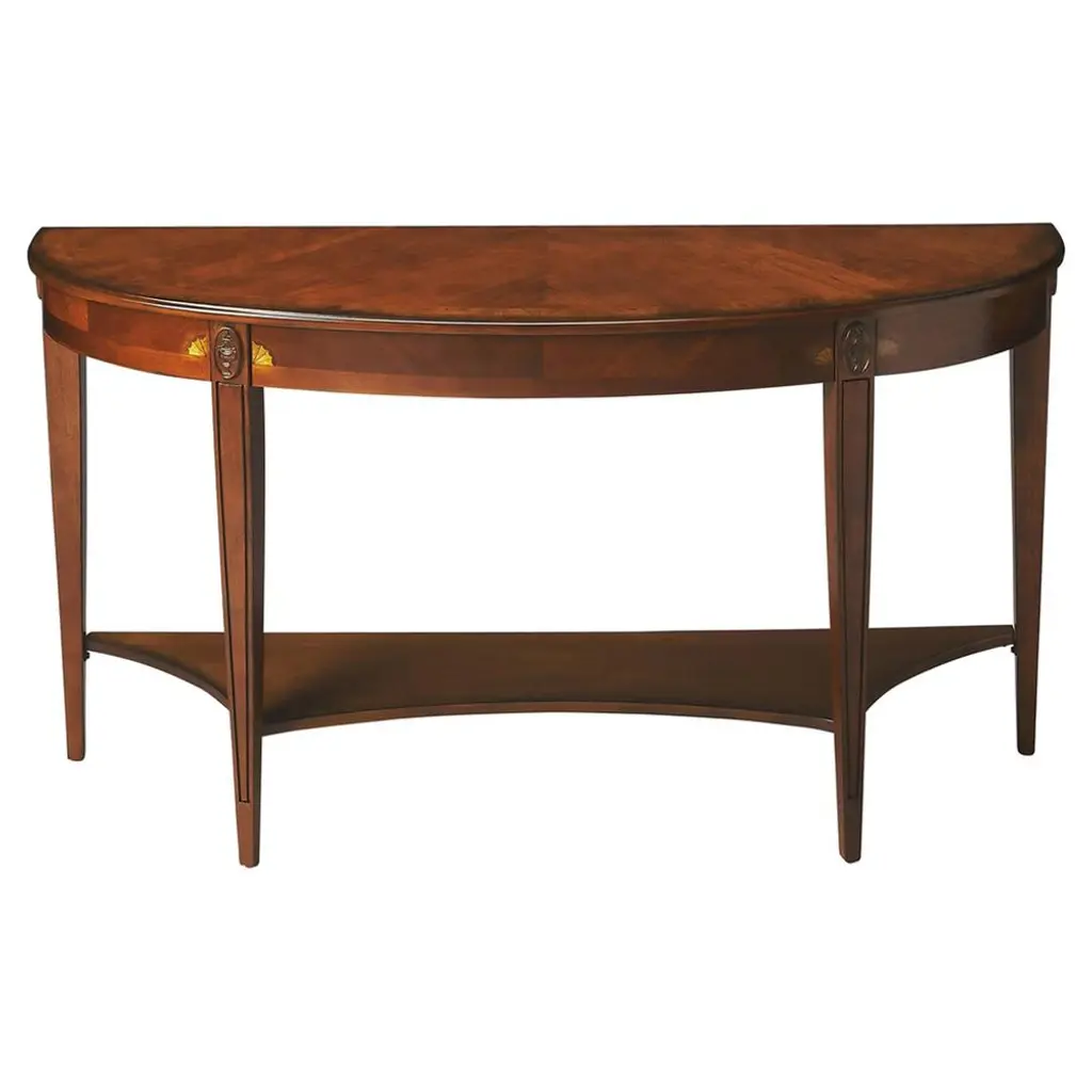 This wide Demilune Console Table is crafted from solid wood with beautifully grained veneers. The design features magnificent tapered legs adorned with carved urn medallion appliques along the apron. A curvaceous lower shelf adds an intriguing counterpoint to the rounded top, enhancing the overall elegance of the piece.