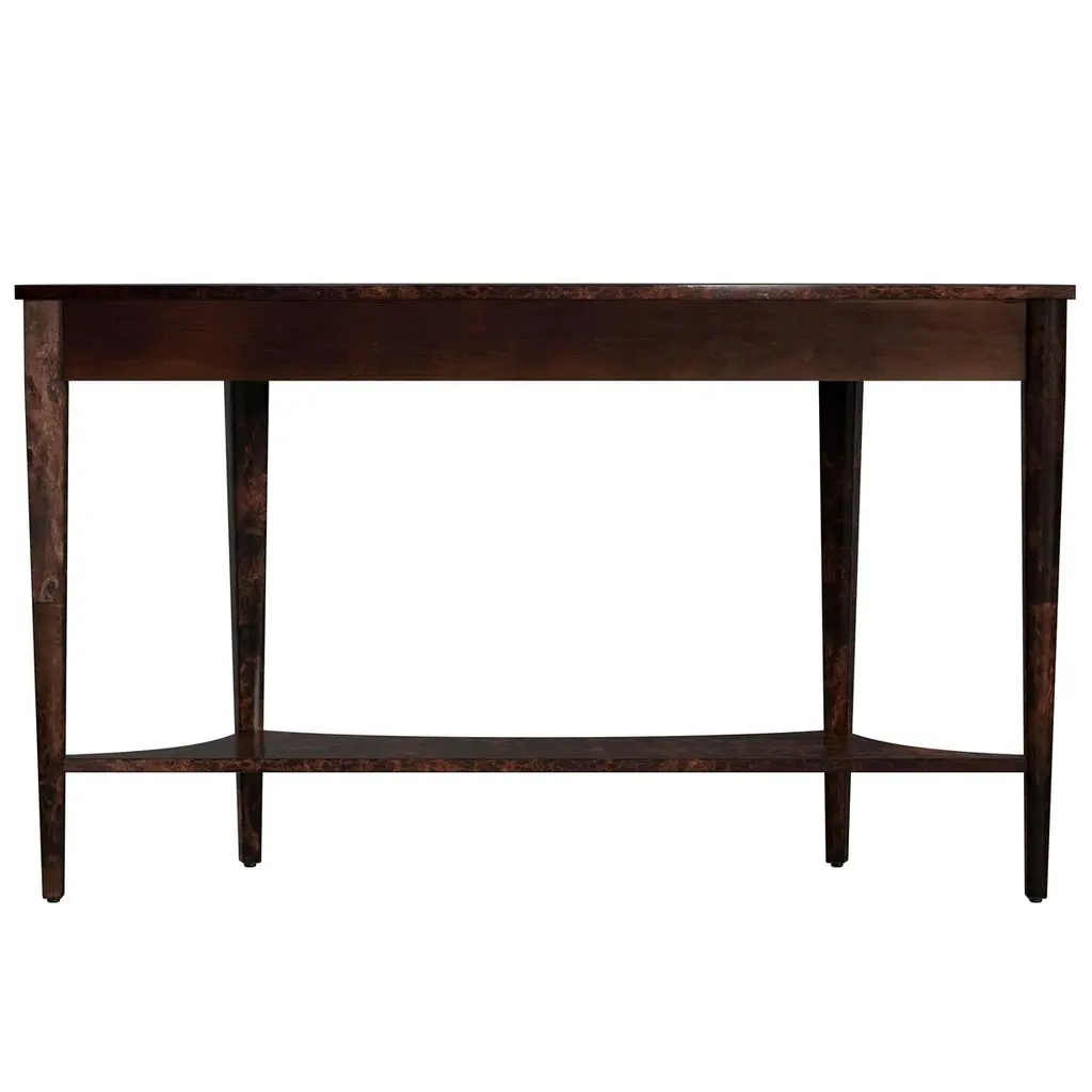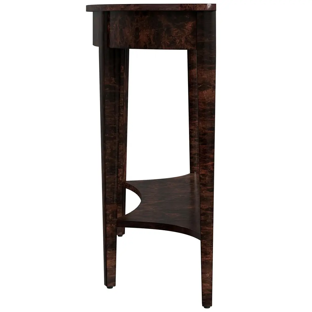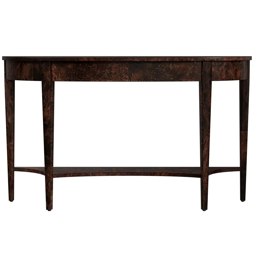 This wide Demilune Console Table is crafted from solid wood with beautifully grained veneers. The design features magnificent tapered legs adorned with carved urn medallion appliques along the apron. A curvaceous lower shelf adds an intriguing counterpoint to the rounded top, enhancing the overall elegance of the piece.