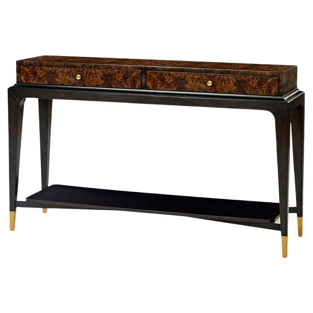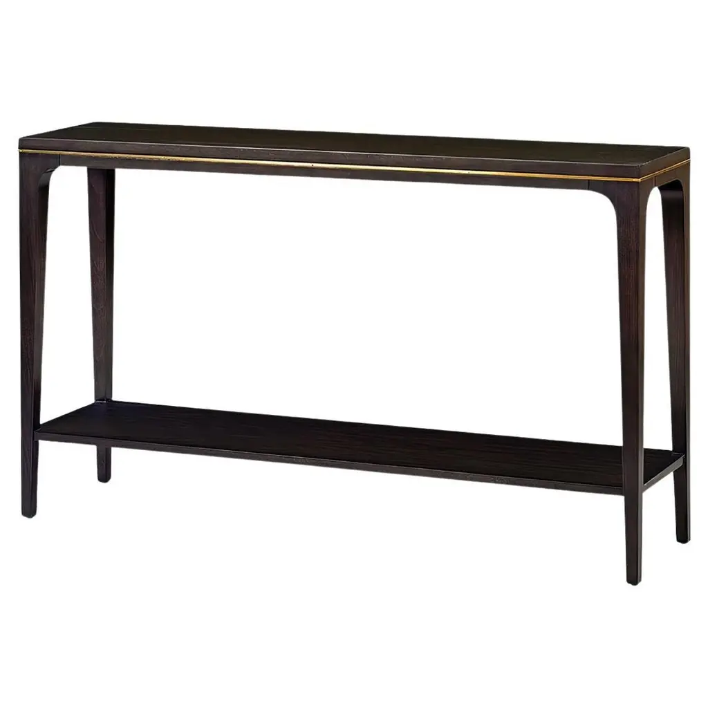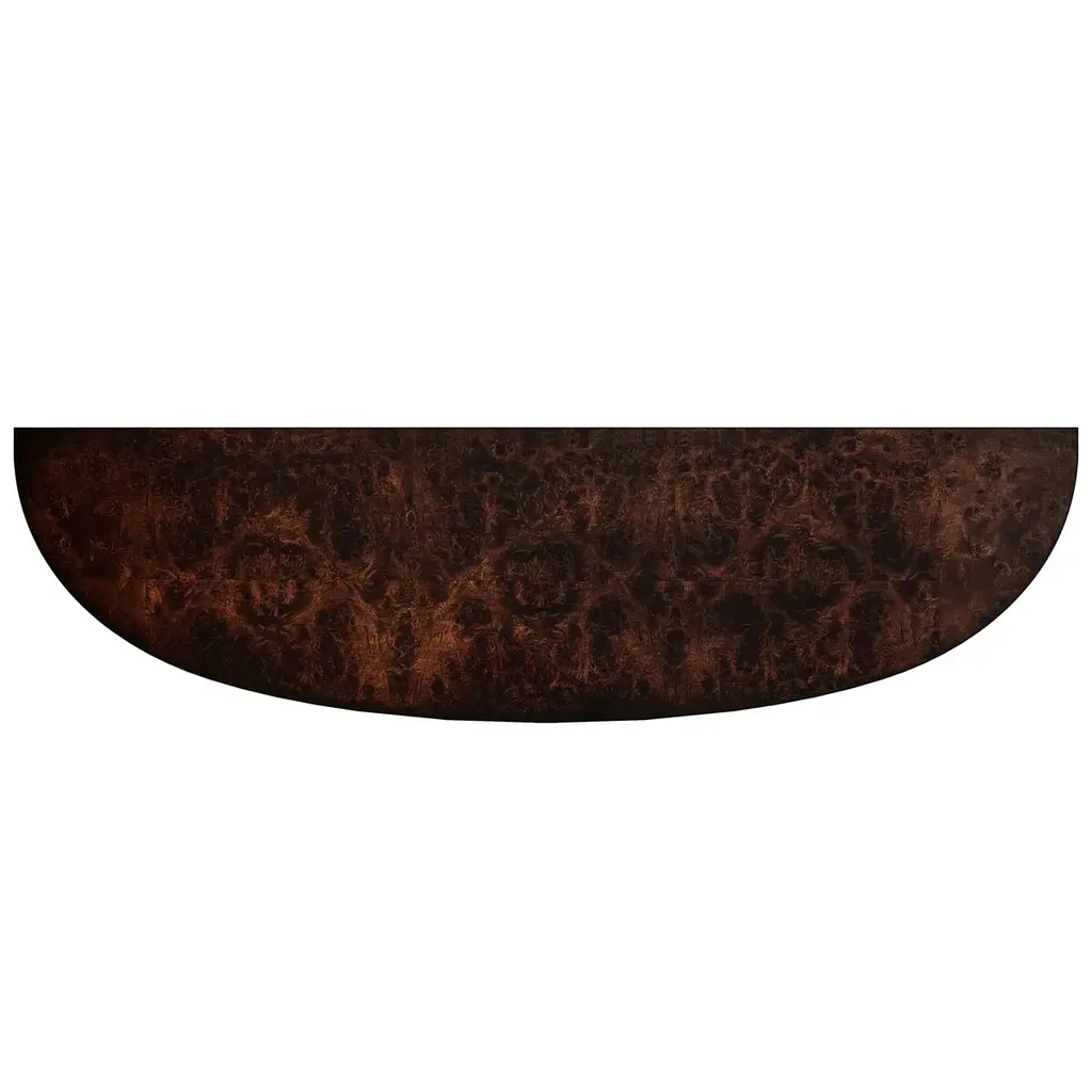 This wide Demilune Console Table is crafted from solid wood with beautifully grained veneers. The design features magnificent tapered legs adorned with carved urn medallion appliques along the apron. A curvaceous lower shelf adds an intriguing counterpoint to the rounded top, enhancing the overall elegance of the piece.