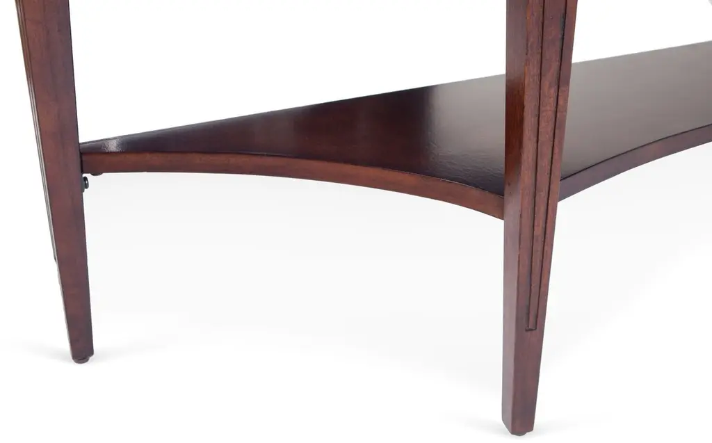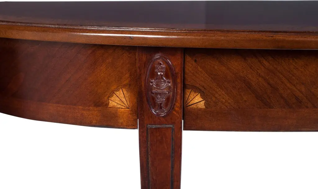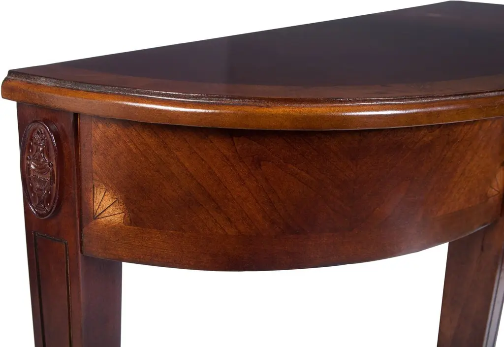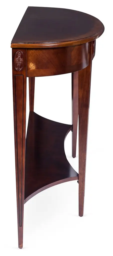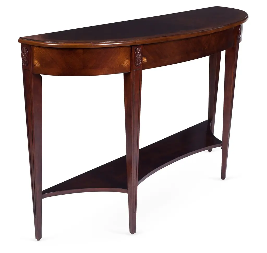 This wide Demilune Console Table is crafted from solid wood with beautifully grained veneers. The design features magnificent tapered legs adorned with carved urn medallion appliques along the apron. A curvaceous lower shelf adds an intriguing counterpoint to the rounded top, enhancing the overall elegance of the piece.