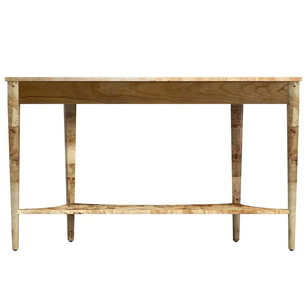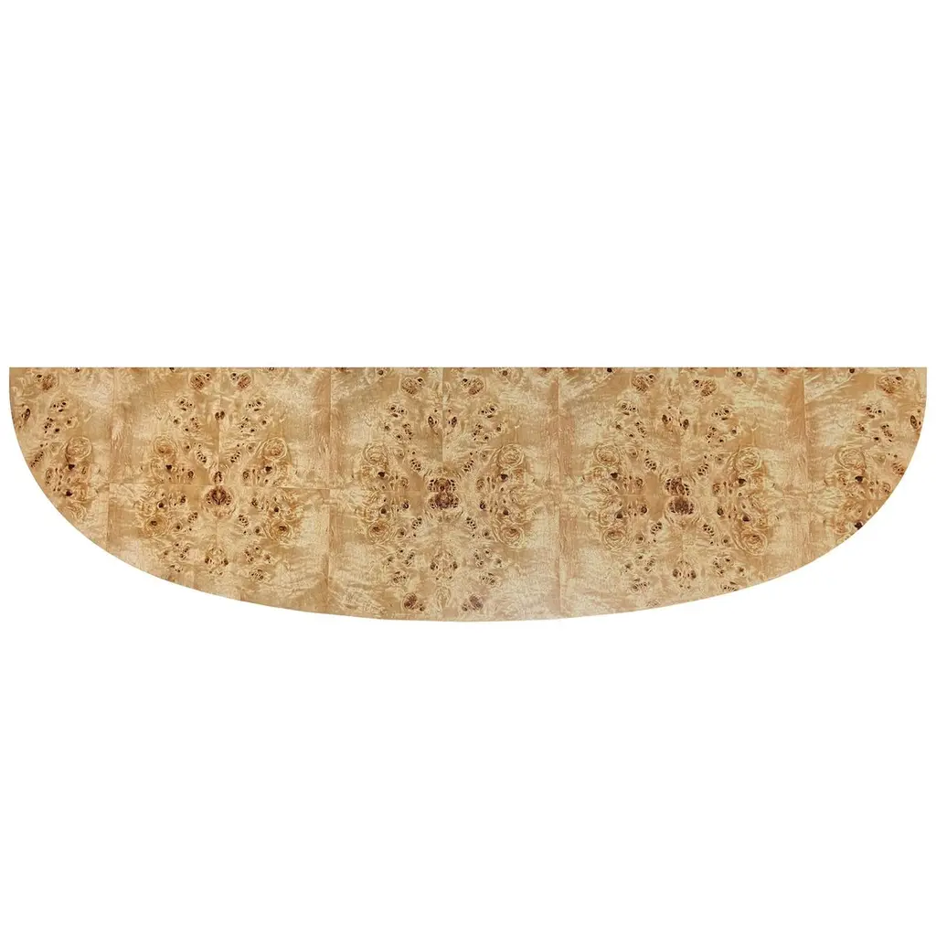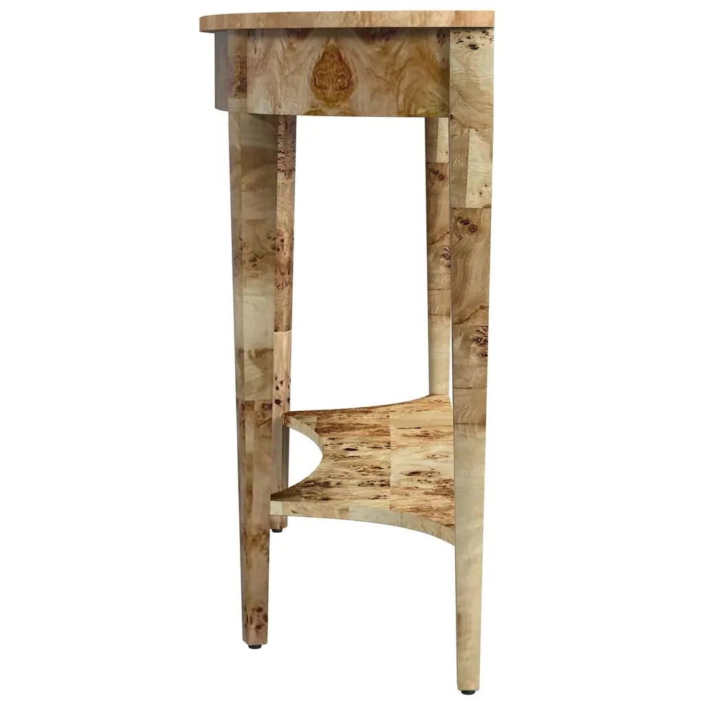 This wide Demilune Console Table is crafted from solid wood with beautifully grained veneers. The design features magnificent tapered legs adorned with carved urn medallion appliques along the apron. A curvaceous lower shelf adds an intriguing counterpoint to the rounded top, enhancing the overall elegance of the piece.