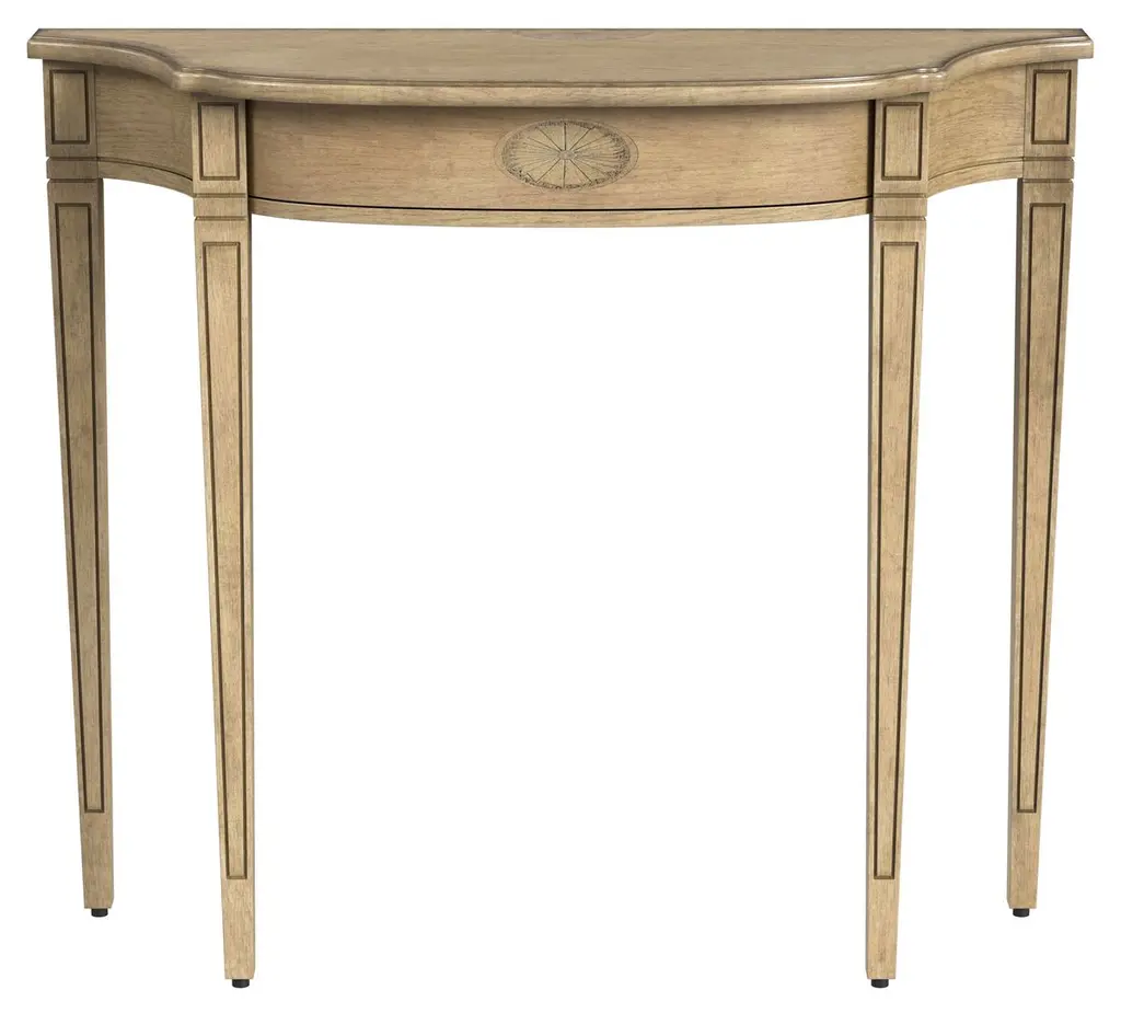 With simple lines, traditional styling and demilune shape, this elegant console table will enhance your space for years to come. Crafted from select solid Woods and choice veneers and beautifully finished in antique beige. Durably Constructed With: Rubberwood Solids, MDF, Veneers Product Construction Features: Wood Slide,Finish Distressing Product Assembled Measurement & Weight: 30.25" H x 36.0" W x 14.25" D -- 26.0 lbs. 120 lbs. Suggested weight capacity Item Arrives: Needs Assembly Wood, like all natural materials, has inherent disparities in color and grain pattern. Variations in shade and markings are normal and can be expected with the natural materials used in the construction of this product. Photo may slightly differ from actual item in terms of color/finish due to the lighting during photo shoot or the monitor's display.