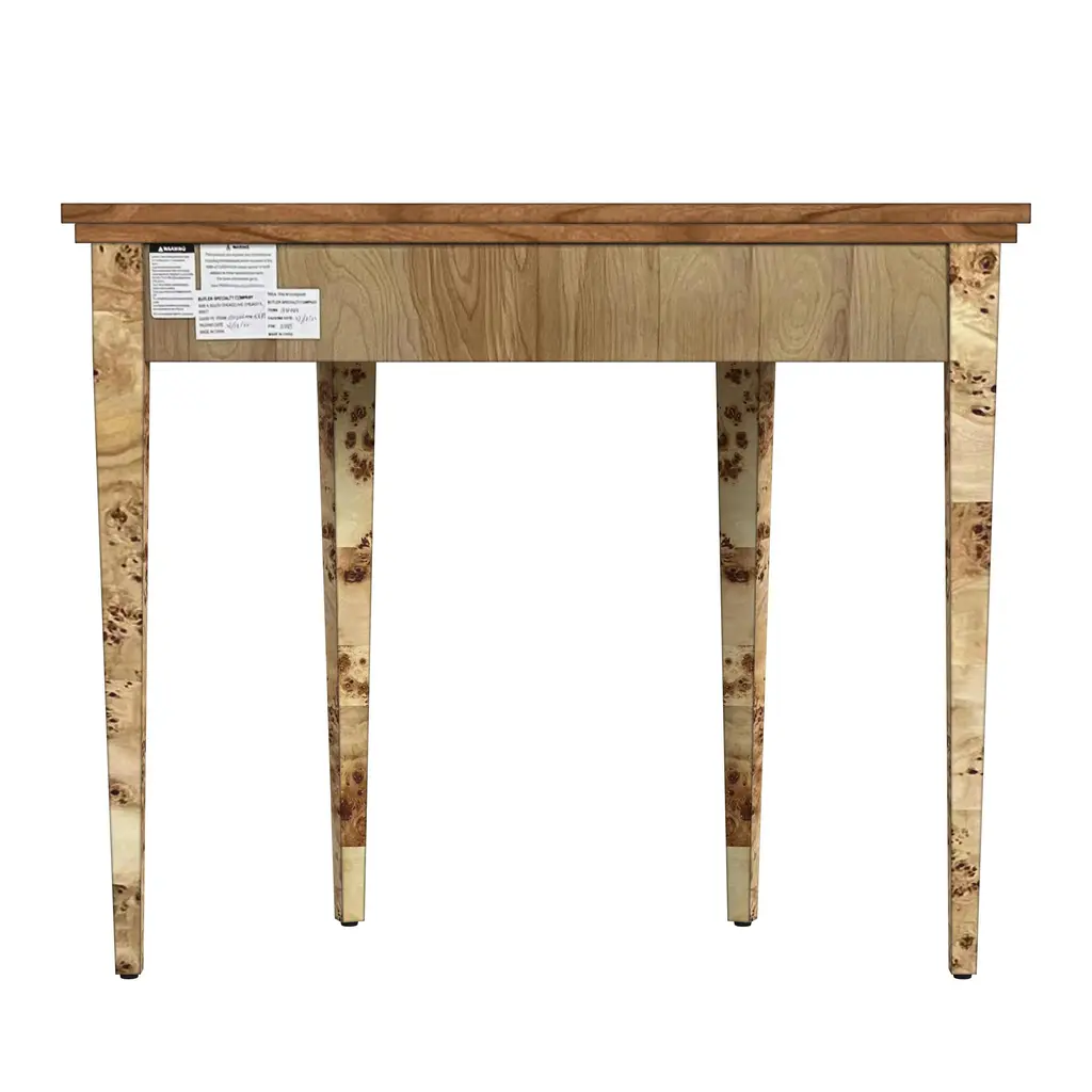 With simple lines, traditional styling and demilune shape, this elegant console table will enhance your space for years to come. Crafted from select solid Woods and choice veneers, this classic design boasts a rich Cherry finish and a beautiful cherry veneer top with a maple veneer inset border. The front apron and tapered legs are adorned with lovely carved details. It is the perfect addition in the living room, hall or entryway. Durably Constructed With: Rubberwood Solids,MDF, Burl Wood Veneer from Cherry and Maple Product Assembled Measurement & Weight: 30.25" H x 36.0" W x 14.25" D -- 26.0 lbs. 120 lbs. Suggested weight capacity Item Arrives: Needs Assembly Wood, like all natural materials, has inherent disparities in color and grain pattern. Variations in shade and markings are normal and can be expected with the natural materials used in the construction of this product. Photo may slightly differ from actual item in terms of color/finish due to the lighting during photo shoot or the monitor's display.