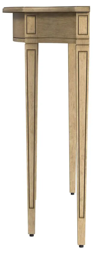 This Pembroke-inspired console is highly elegant, yet unpretentious. Crafted from hardwood solids and wood products, it features beautiful curves with a veneer top. The design includes intricate inlays, enhancing its sophisticated appearance.