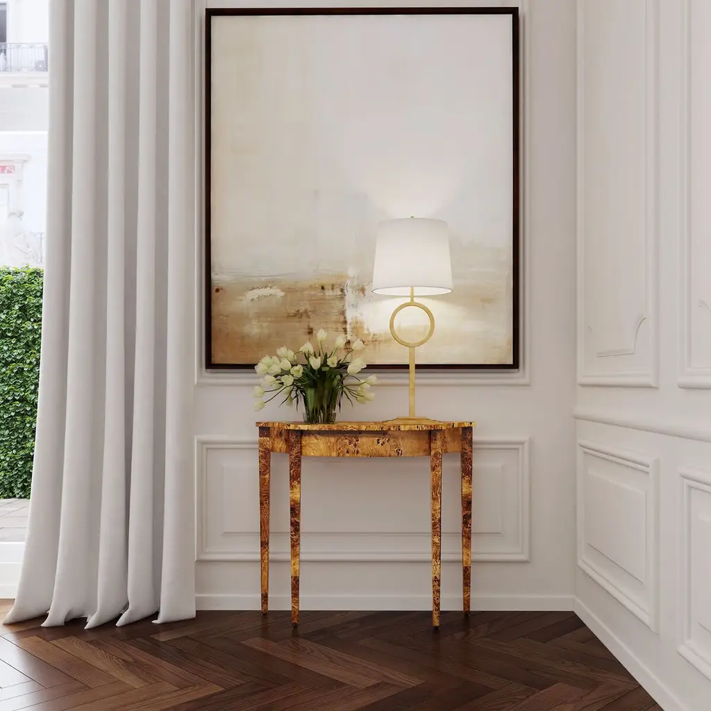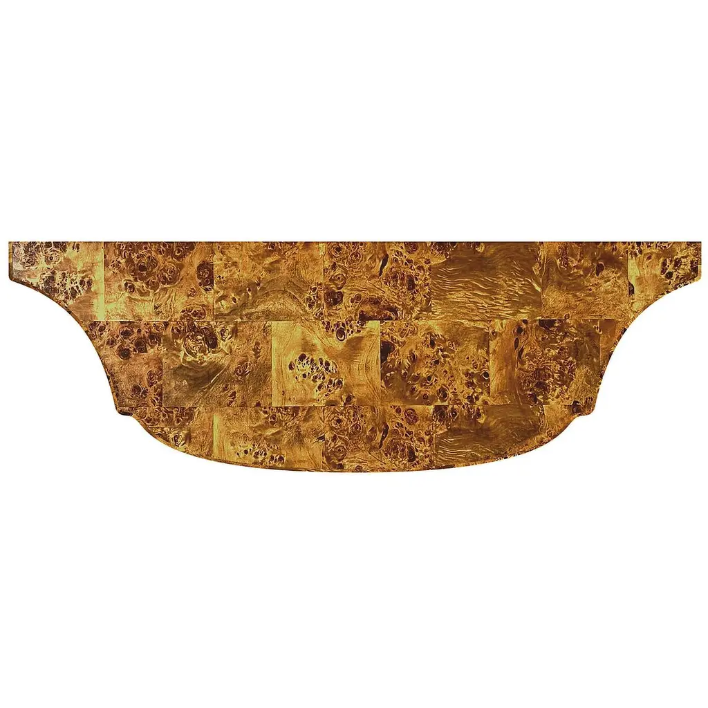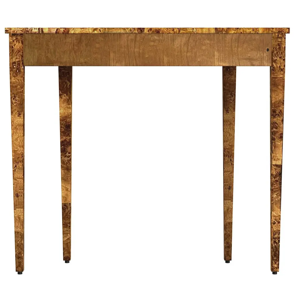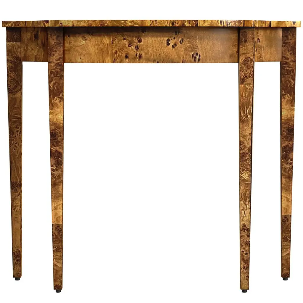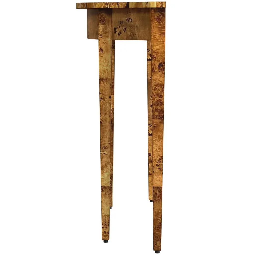 This Pembroke-inspired console is highly elegant, yet unpretentious. Crafted from hardwood solids and wood products, it features beautiful curves with a veneer top. The design includes intricate inlays, enhancing its sophisticated appearance.