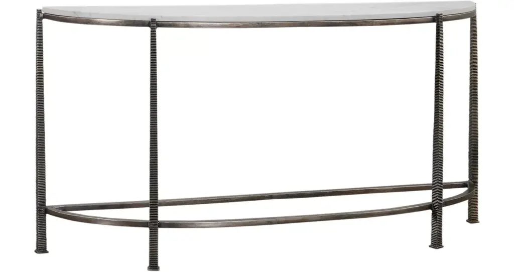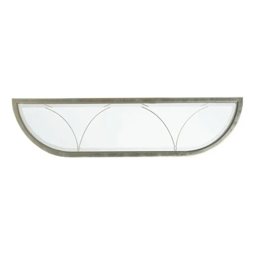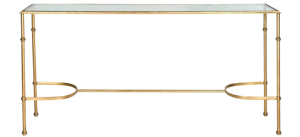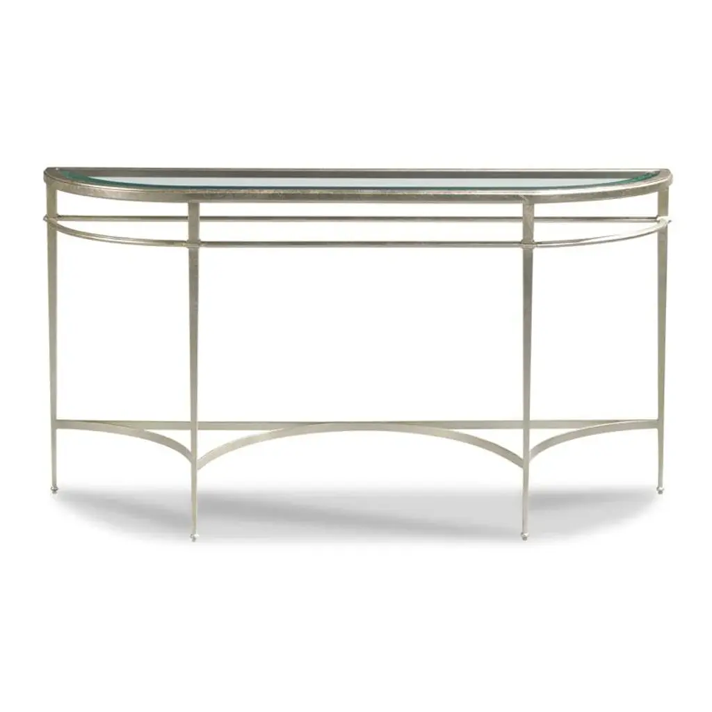 A lovely hall table inspired by 19th Century French originals with an inset beveled glass top elevated by gracefully tapering posts, joined by shaped stretchers. The table is crafted in forged steel decorated with silver leaf.